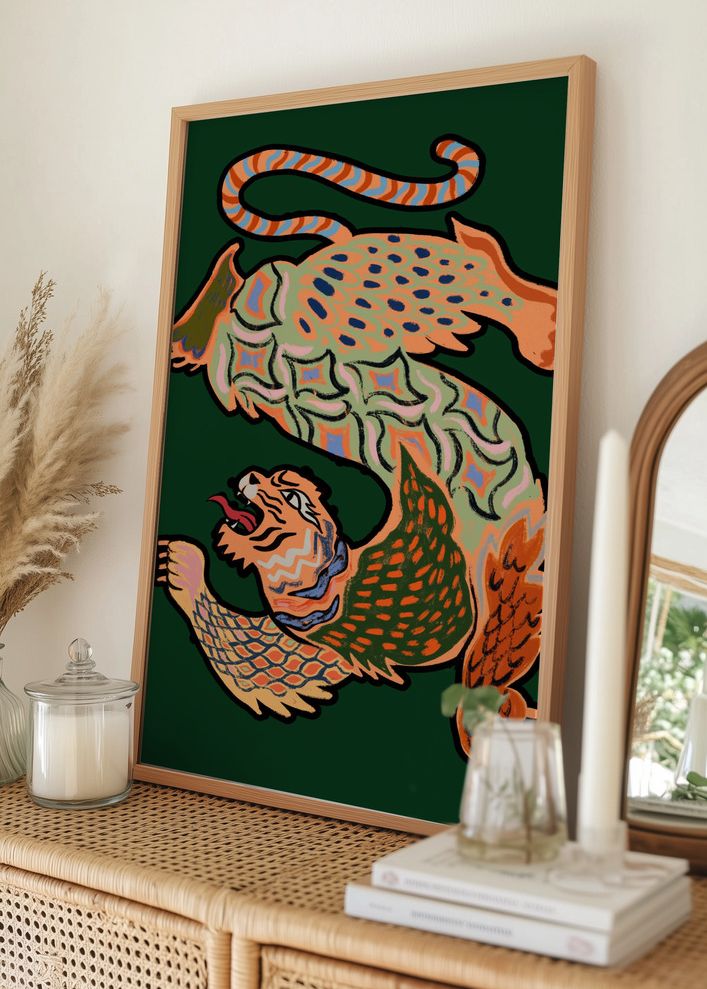 Denna poster är ett uttrycksfullt konstverk som fångar ögat med sitt unika motiv av ett fantasifullt djur. Bildens huvudfärger är levande nyanser av orange, grön, och blå, som ger affischen en livfull och dynamisk känsla. Det grönfärgade bakgrunden fungerar som en perfekt kontrast, vilket gör motivet ännu mer framträdande och iögonfallande. Djurets detaljer med sina olika mönster och färger bidrar till ett lekfullt och spännande uttryck, perfekt för den som söker en utsmyckning med karaktär.