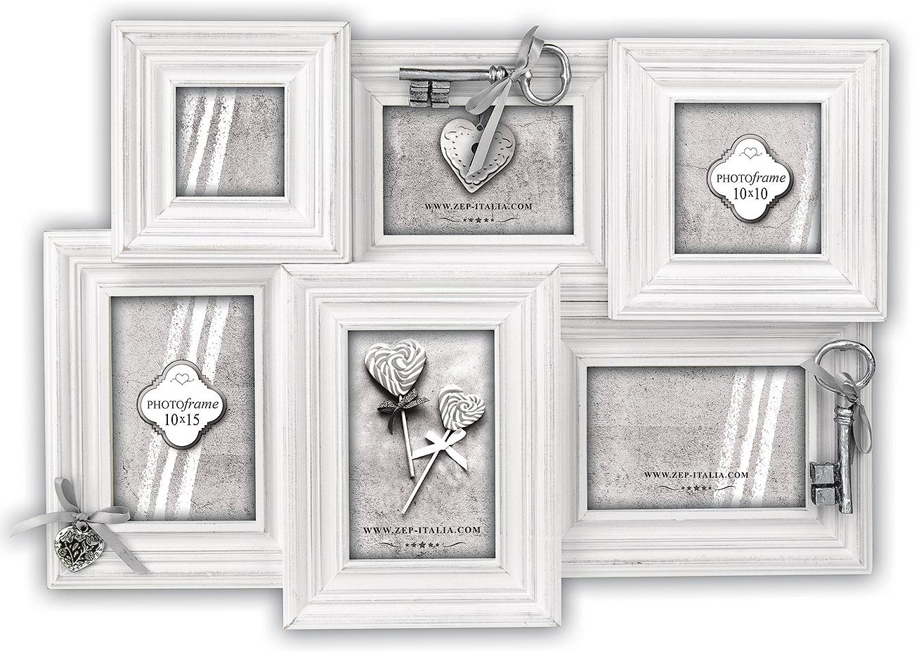 Framkalla dina favoritbilder och rama in dem i denna lantliga collageram med dekorativa detaljer i silver. Denna collageram har plats för 6 bilder i bildstorlek 7x7 cm / 9x13 cm / 10x10 cm/ 10x15 cm. Collageramen är tillverkad i trä och går i en vit nyans. Yttermått 53x37,5 cm. Väggfäste finns.
