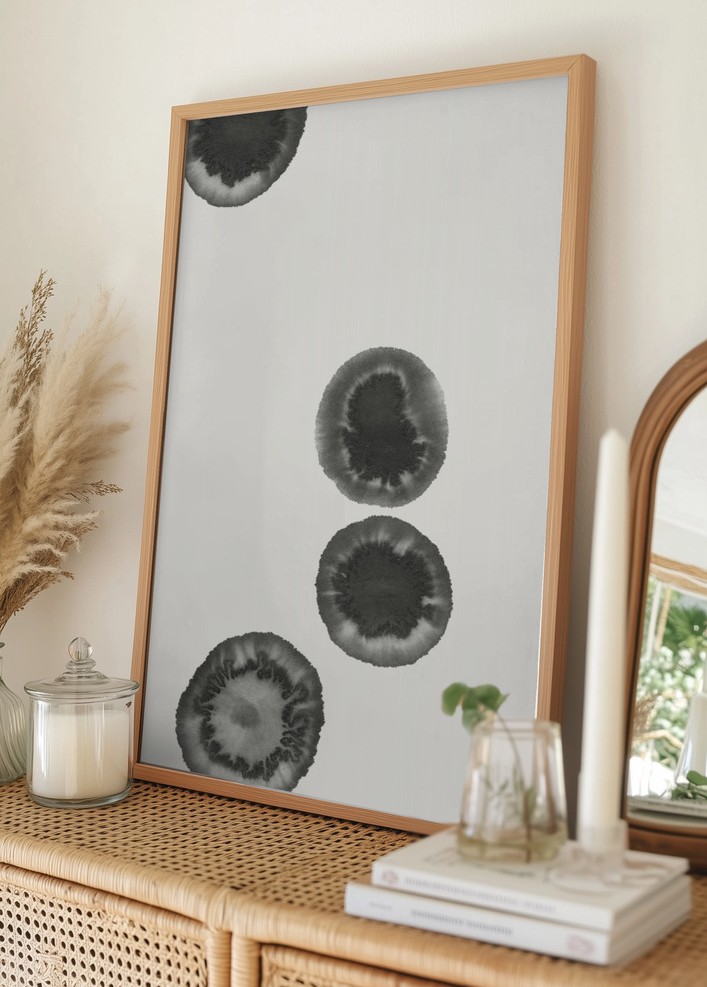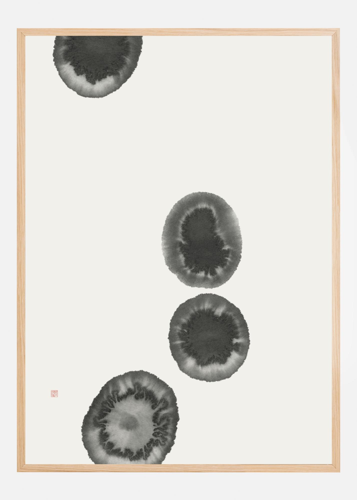Denna eleganta poster erbjuder en minimalistisk design med en tidlös känsla. Motivet består av fyra abstrakta, cirkulära former i toner av mörkgrått och svart som står i kontrast mot en mjukt vit bakgrund. Den sobra färgpaletten gör denna affisch till ett perfekt komplement i både moderna och klassiska inredningar.