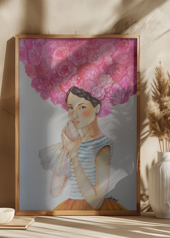Affischen präglas av en palett med rosa och lila nyanser som dominerar blomsterarrangemanget, tillsammans med kontraster i pastellblått från kvinnans randiga topp och varma toner av orange från hennes kjol. Inramningen av motivet inuti ramen fokuserar på detaljerna och färgsättningen, komplett utan störande element, vilket gör denna affisch till en perfekt inredningsdetalj för den som uppskattar konst med en feminin touch och en palett som både är förtrollande och stilsäker.