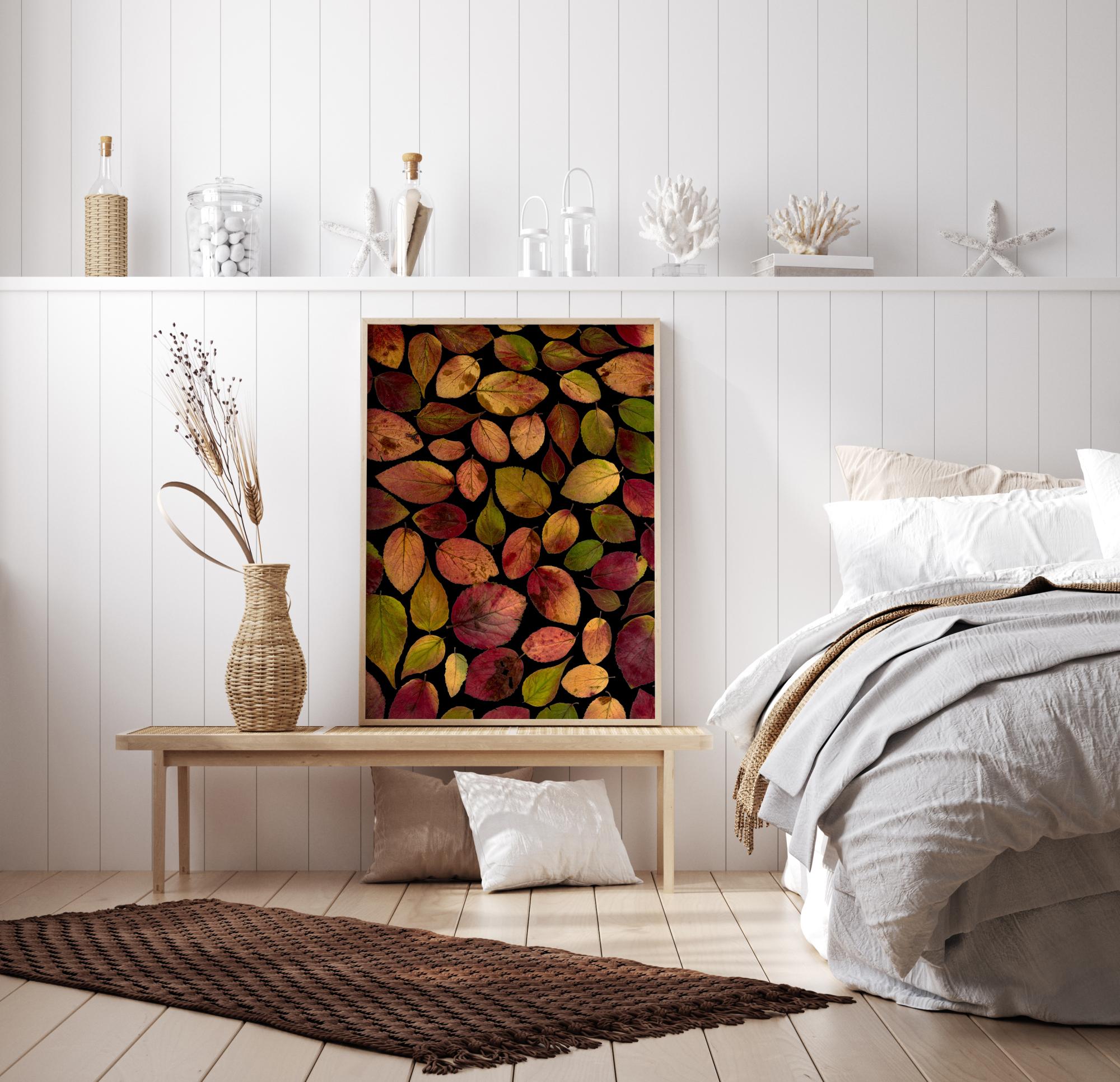 En mönstrad poster med höstlöv. En rad gula, rosa och röda färger möter ögat i denna organiserade lövsamling. Alla löven går ihop mot en mörk bakgrund, vilket ger höstens livfullhet till den här postern. En perfekt färgklick i köket eller hallen.