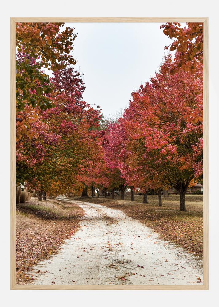 En landskapsposter av en höstpark och gränd. En vit grusväg skär genom levande rödbladiga träd. Den ljusblå himlen speglar vägen när den svänger i fjärran. Återupplev höstfärgernas skönhet varje dag med den här postern i ditt hem. Du kan hänga den här postern tillsammans med vilken målning som helst.