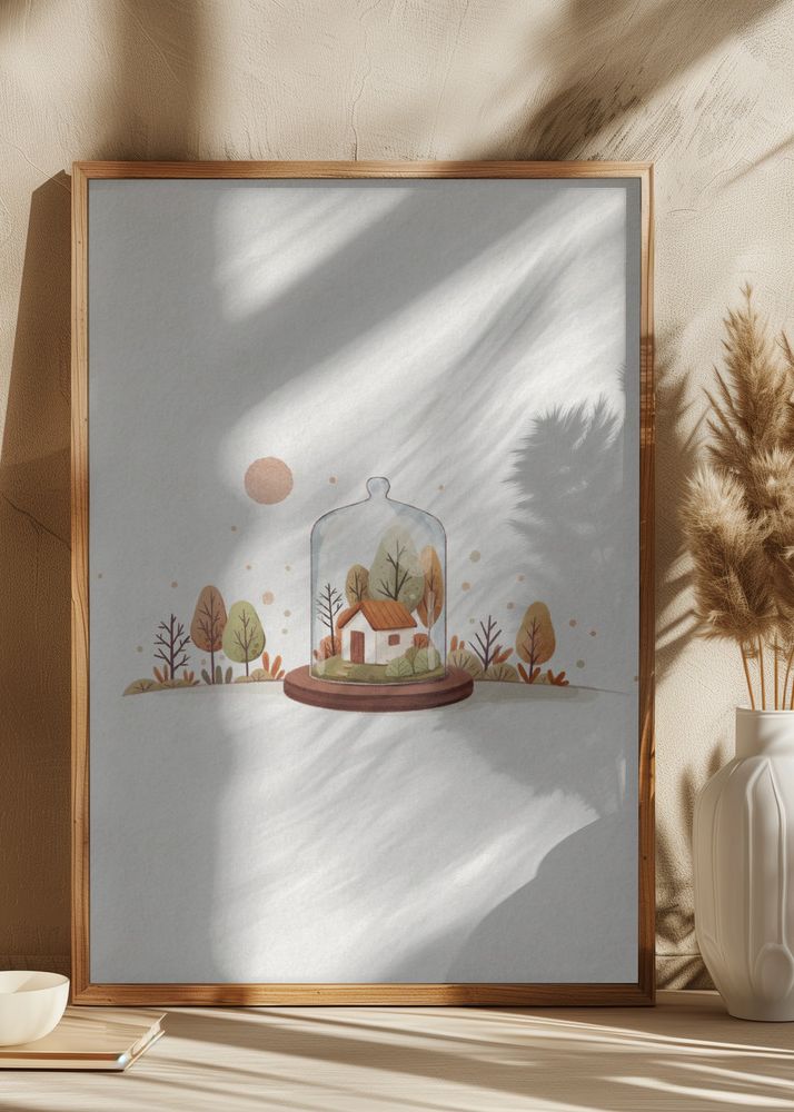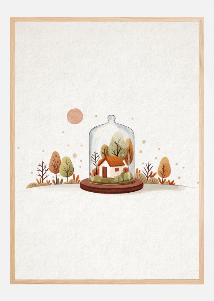 Denna charmiga affisch visar en pittoresk scen av ett litet hus inneslutet i en glaskupa, uppburen av en elegant brun sockel. Huset har en vänlig och välkomnande atmosfär, omgivet av miniatyrträd i varierade nyanser av brunt och orange. Detta konstverk är perfekt för den som uppskattar detaljrika illustrationer och vill skapa en mysig känsla i sitt hem. Denna print är en kreativ gåva till husälskare eller ett stämningsfullt tillskott till en sagolik inredningsstil.
