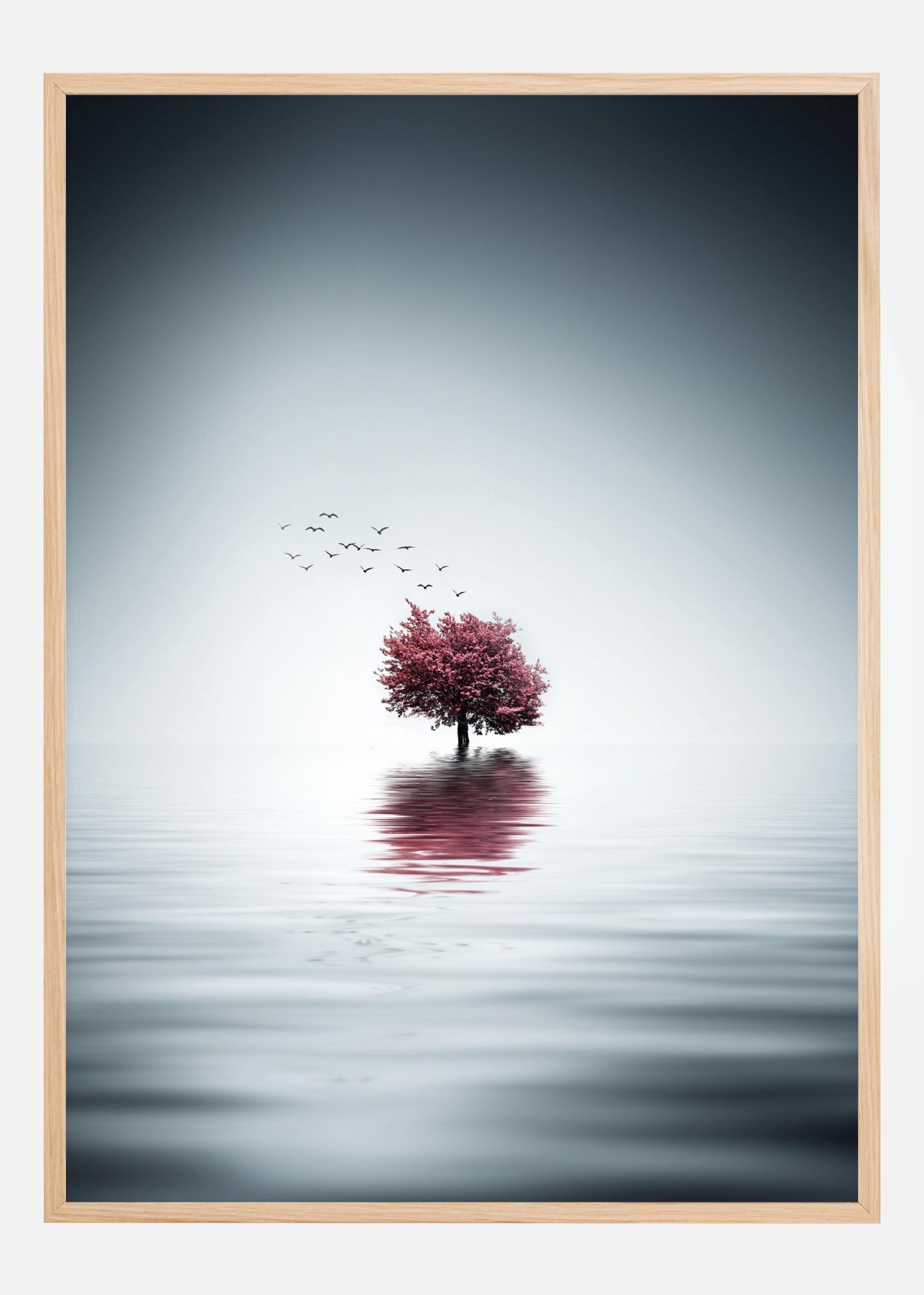 En enkel naturposter av en sjö med ett ensamt träd i mitten. De starka färgerna och krusningarna för blicken till det lilla körsbärsträdet med rosa blommor. En flock fåglar flyger iväg i en halo av ljus. Du kan riktigt känna naturens mystik i den här bilden.