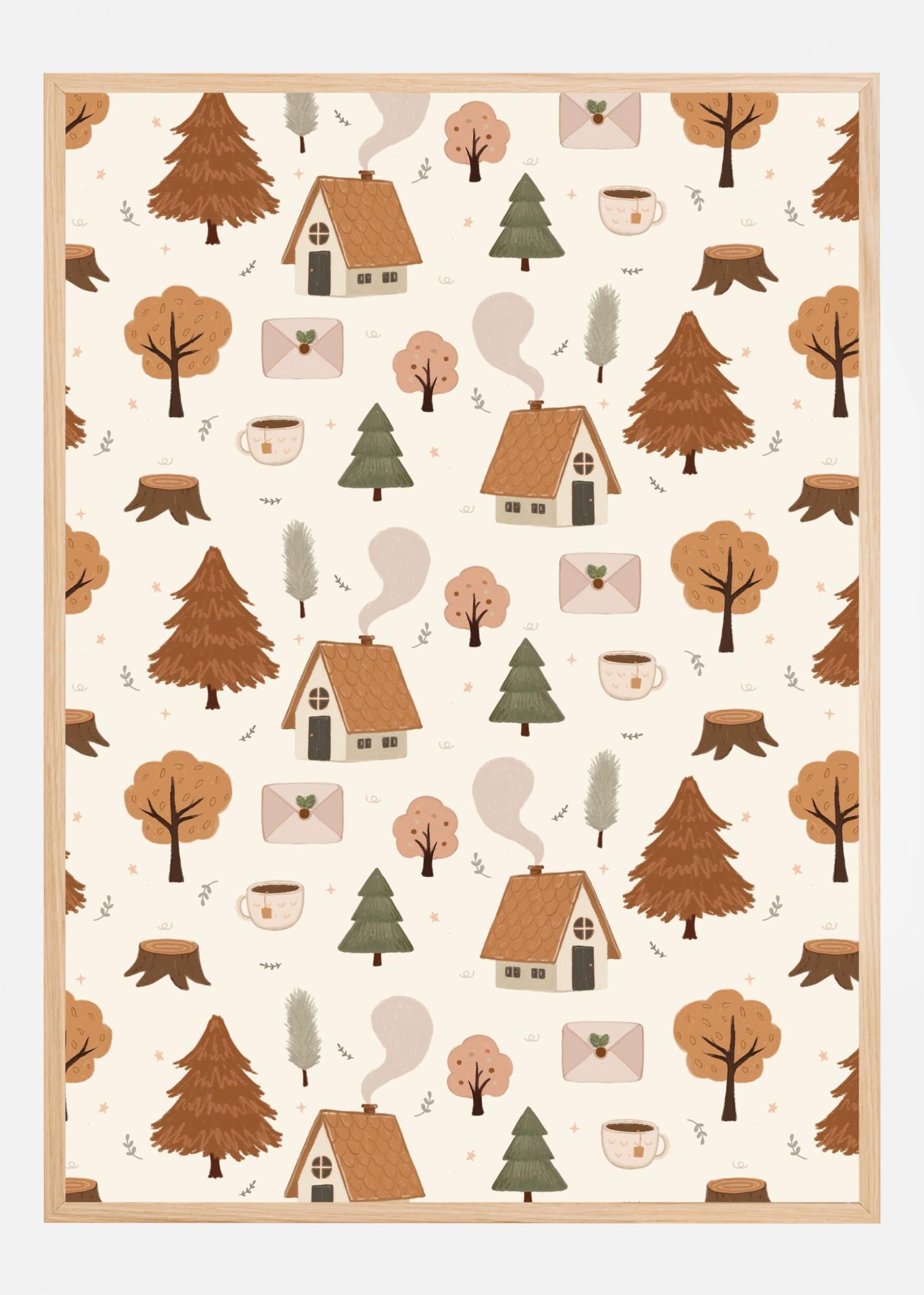 Denna charmiga och stilrena poster är fylld med idylliska skandinaviska scener. Motivet karakteriseras av en samling av små lantliga stugor omgivna av en mysig skogsmiljö, komplett med varierande trädtyper som ger en känsla av ett lugnt skogslandskap. Designen är både lekfull och harmonisk, med en genomtänkt arrangemang av natur- och arkitekturelement som smälter samman på ett sätt som är tilltalande för alla åldrar.