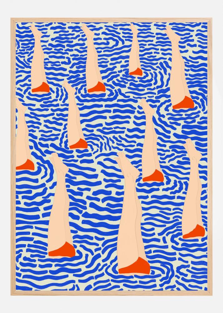 Denna färgstarka poster visar en lekfull och stiliserad illustration av ben i röda baddräkter som sticker upp ur ett mönstrat blått vatten. Motivet upprepas över hela ytan och skapar en hypnotisk känsla av rytm och rörelse, perfekt för dig som älskar konst med humor, stil och färg.