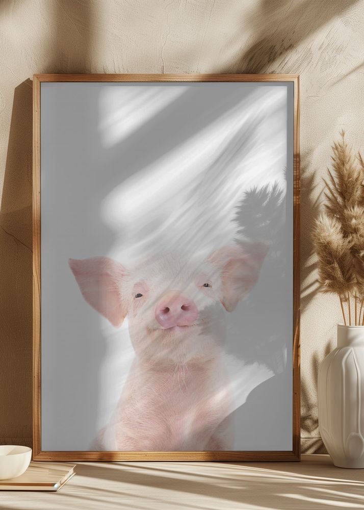 Upplev lantlig charm och en känsla av hjärtlig glädje med denna förtjusande poster som framställer en bedårande liten gris med en djup blick och ett oskyldigt leende. Denna print kapturerar skönheten hos lantliga motiv och är perfekt för att införa ett lekfullt element i varje rum. Motivet kännetecknas av mjuka pastelltoner av vitt och rosa, vilket ger en behaglig och uppiggande atmosfär.