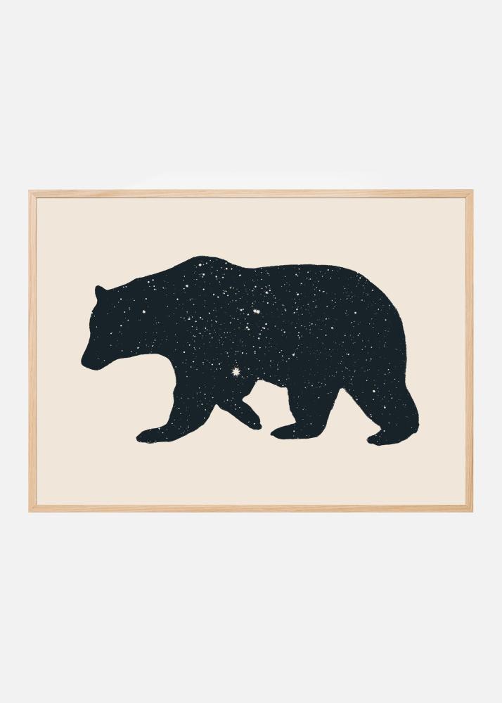 Denna unika poster skildrar en mäktig björnsilhuett som verkar vara fylld med en stjärnklar natthimmel. Detaljerna i björnens form är utsmyckade med små prickar och stjärnor som ger intrycket av en kosmisk formation, vilket gör denna print till ett stjärnspäckat tillskott i vilket rum som helst. Motivet är framställt i sofistikerade nyanser av svart på en krämig bakgrund, en kombination som erbjuder en tidlös och elegant look.