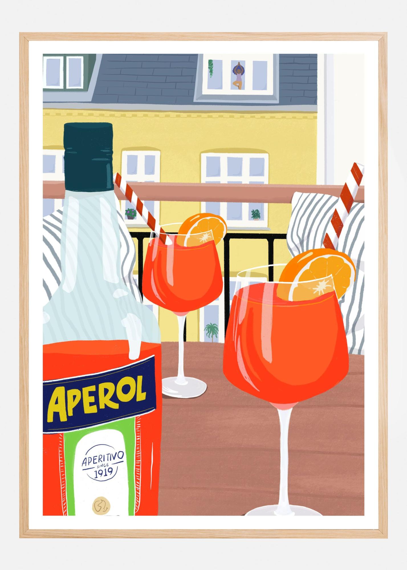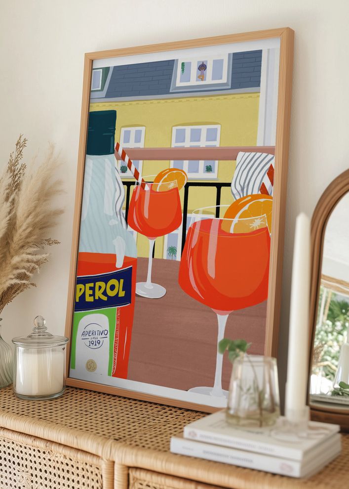Denna livfulla poster fångar essensen av en solig dag i stan med två glas aperitif som huvudmotiv. I förgrunden ser vi en flaska tillsammans med två färgstarka drinkar, vars djupa orangea toner livar upp hela bilden. De randiga sugrören och skivorna av apelsin tillför en lekfull känsla, medan bakgrunden skymtar ett gult hus med stora fönster, som bidrar till en hemtrevlig och avslappnad atmosfär.