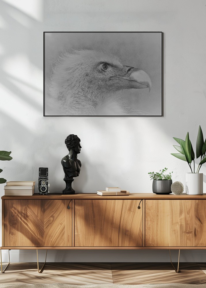 Denna poster presenterar ett imponerande motiv av en örn tecknad i svartvitt. Med en noggrann detaljrikedom fångas örnens kraftfulla uttryck och ståtliga drag, vilket gör denna print till ett iögonfallande inslag i alla rum. Det konstnärliga genomförandet med fina schatteringar och toner bidrar till affischens levande känsla, där örnens blick fångar betraktaren.