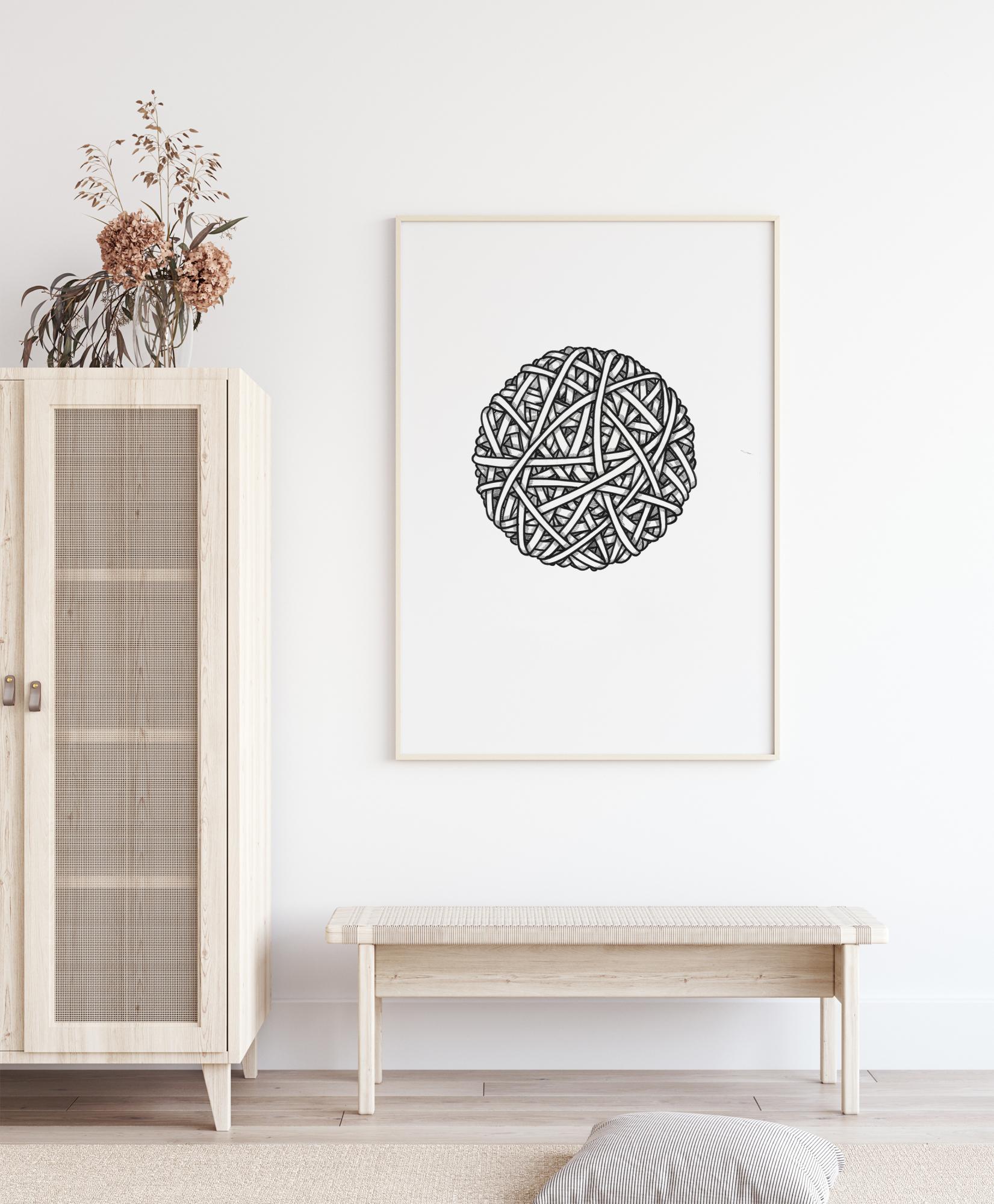 En grafisk poster i svart och vitt på ett nystan format som en boll. En enkel och minimalistisk tavla som passar utmärkt att blanda med andra härliga favoriter i ett större collage.
