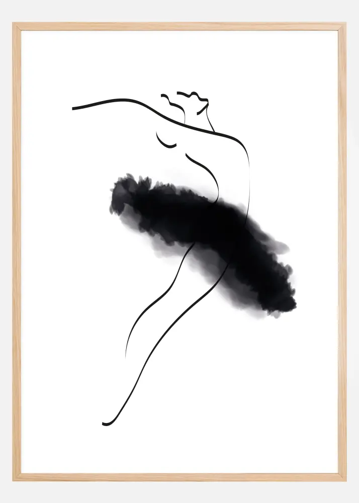 En akvarell på en ballerina i tunna svarta linjer med en mer uttalad svart ballerinakjol. En minimalistisk och stilren poster som passar lika bra i sovrummet eller hallen, som i vardagsrummet eller i biblioteket.