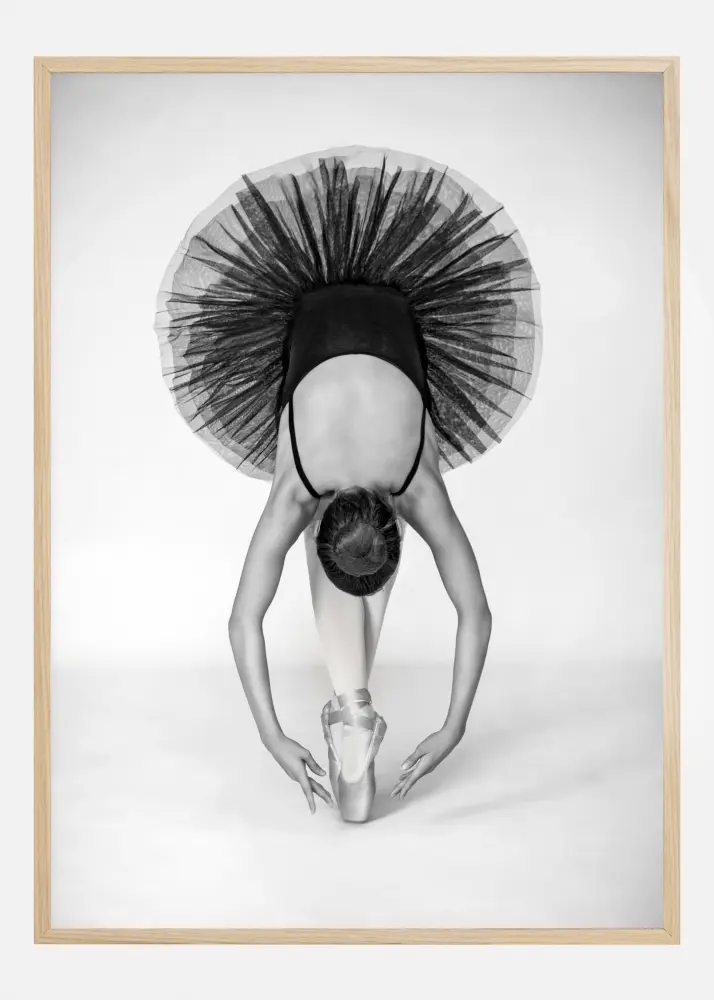 En porträttposter av en ballerina. Den här balettdansösen böjer sig framåt i femte position och skapar två perfekta cirklar med sina armar och en svart tutu. Den svartvita postern får henne att sticka ut och skapar ett elegant, klassiskt utseende som förhöjer en enkel neutral vägg var som helst i hemmet.