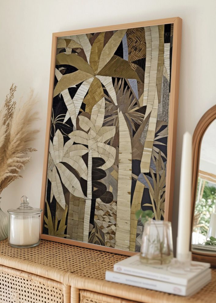 Färgpaletten i denna affisch domineras av naturliga jordtoner, med inslag av beige, brun, ockra och grå, samt kontrasterande svart och vitt som tillsammans ger en sofistikerad och balanserad look. Denna blandning av färger gör printen lätt att matcha med olika inredningsstilar, från modern minimalism till bohemisk charm.