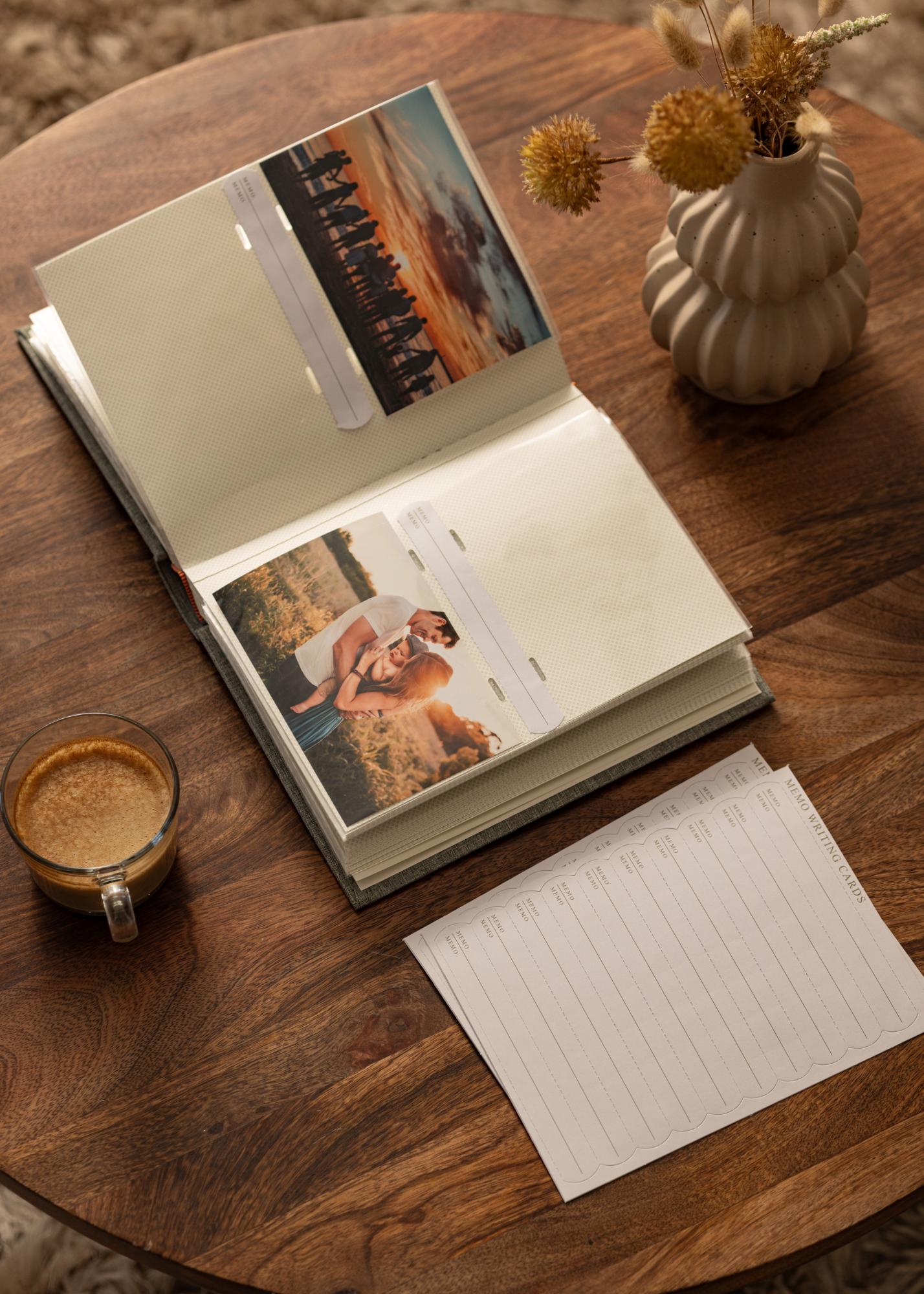 Det finns ett skrivfält för varje bild och med fotofickor för varje bild så är det också smidigt att använda.