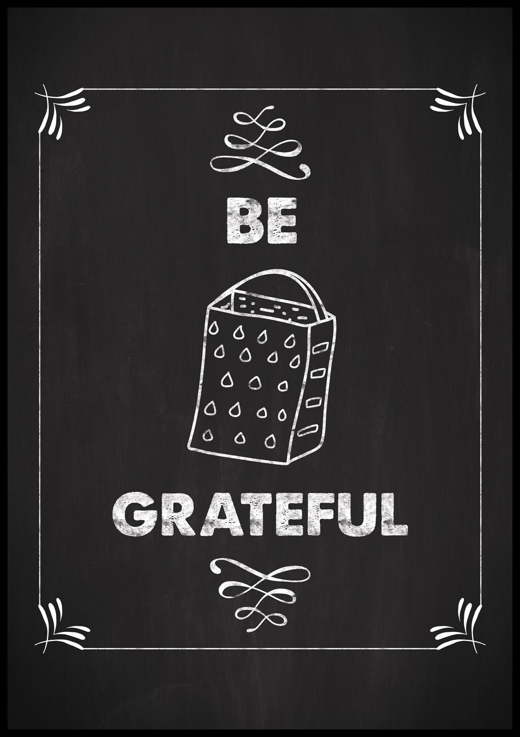 https://www.bga.se/be-grateful-21x29-7-cm-a451012526Be grateful Posterhttps://www.bga.se/resource/u4V1/hQ7/GNtsmdM2YCA/Affischer-Posters/Inramade/Lorand_Coc/32-KP_beGrateful.jpg99.00SEKDiscontinued/Posters/Posters/NyheterGrafiskt print med ett humoristiskt budskap och utseendet av att vara skriven med krita på en svart tavla. Postern passar fint in i köket på en tavelvägg tillsammans med andra bilder som har en koppling till att äta och laga mat, eller varför inte liva upp lunchrummet på arbetsplatsen med ett roligt motiv. Rama in det snygga trycket med en svart tavelram som förstärker känslan av att vara en skoltavla.Bildverkstad21x29.7 cm (A4)21x29.7 cm (A4)2016-08-12T17:13:47+02:00