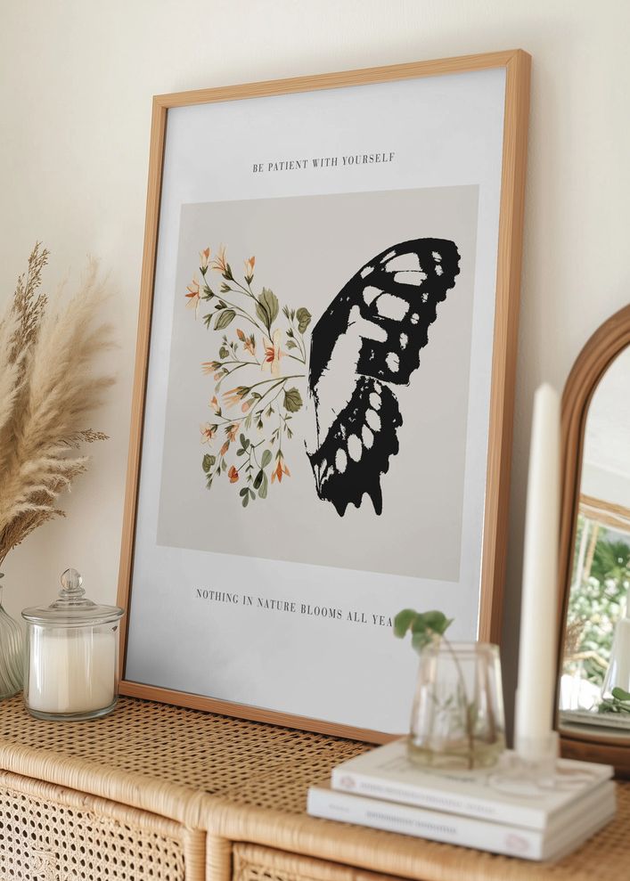 Texten ”BE PATIENT WITH YOURSELF” och ”NOTHING IN NATURE BLOOMS ALL YEAR” ramnar verket och förmedlar ett tidlöst budskap om tålamod och naturlig skönhet. Perfekt som affisch, print eller poster för de som söker efter en dekorativ och inspirerande väggdekoration med ett naturligt tema. Motivets lugna färgpalett gör det lätt att matcha i de flesta miljöer.