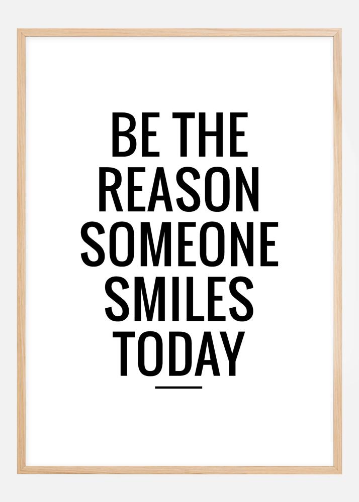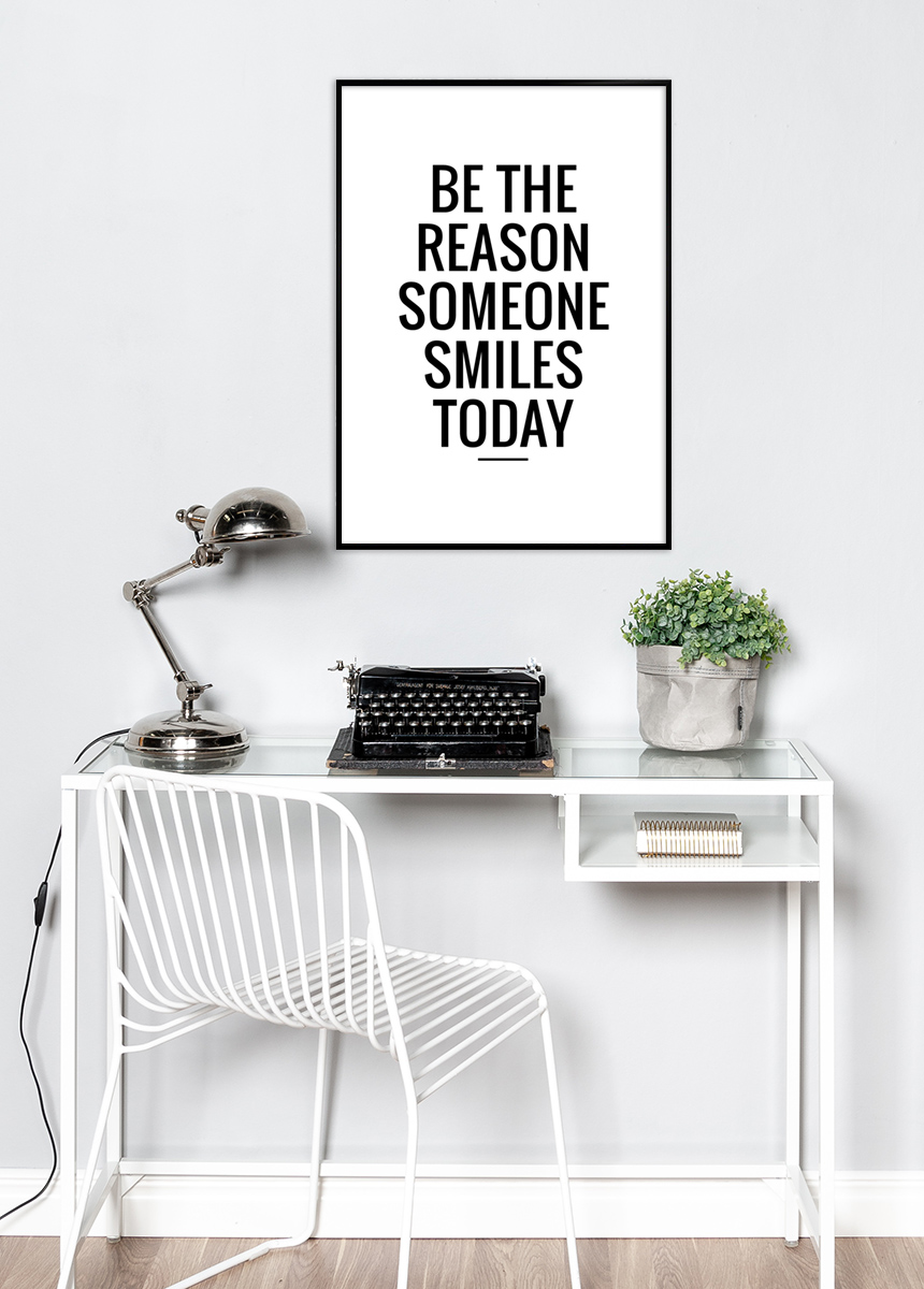 Vad är det finaste du som medmänniska kan göra för en annan? Självklart finns det en rad olika gärningar att välja mellan, men i slutändan är det leendet du får som respons som är det viktigaste! Denna stilfulla print ger en fin och viktig vägledning i vardagen. Postern är vit och har ett svart tryck med texten ”Be the reason someone smiles today”. Eftersom den är svartvit kombineras den med fördel med dina favoritfärger på ram eller passepartout. Finns i 6 olika storlekar och prisklasser.