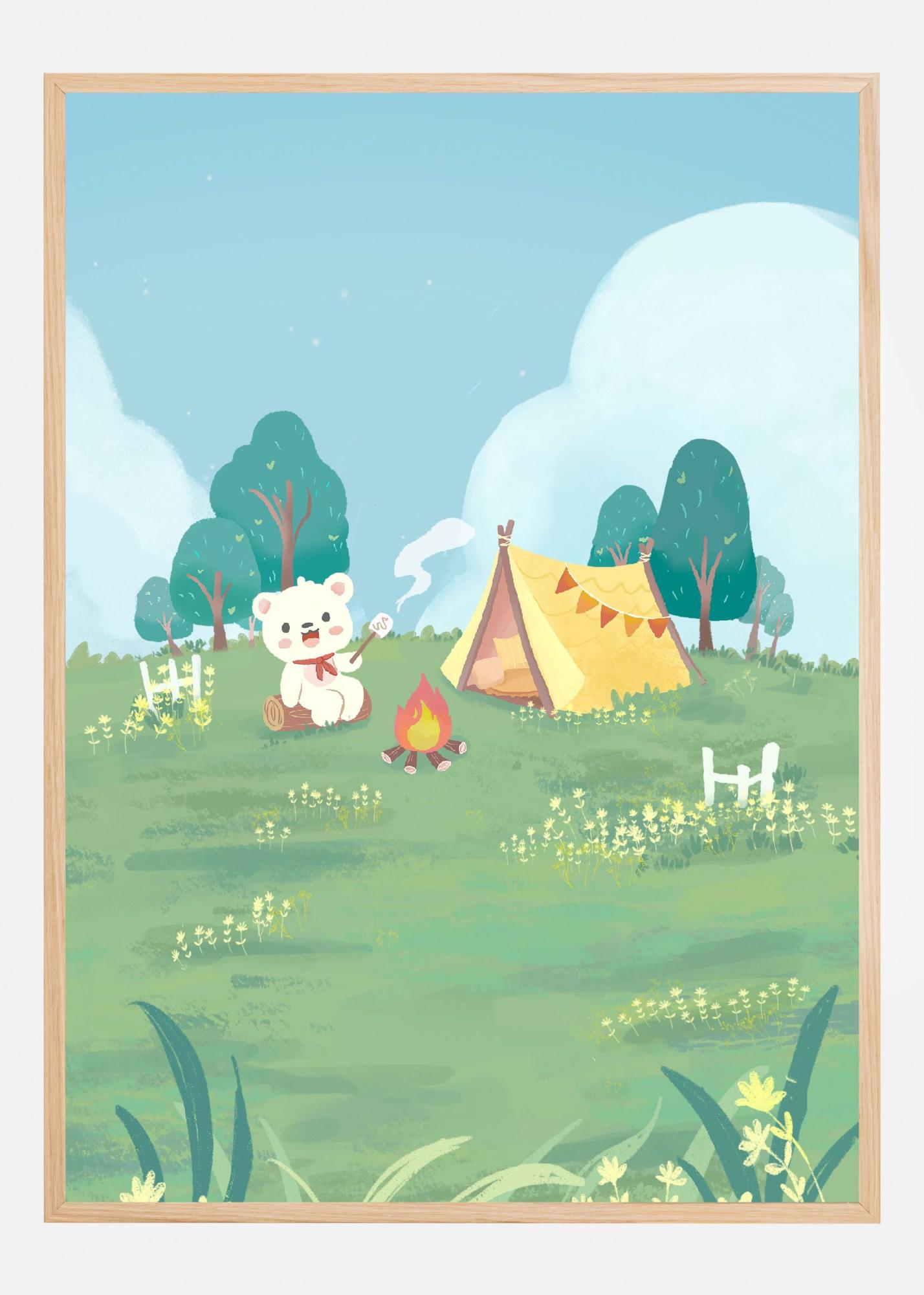 Upptäck lugnet och berika ditt rum med denna charmiga poster som framkallar känslan av en idyllisk vildmarksretreat. Motivet avbildar en rofylld scen med en gullig vit björn vid en sprakande lägereld, precis intill ett gyllene tält omgivet av frodig grönska. Denna print utstrålar en känsla av äventyr och avkoppling, perfekt för den som vill addera ett inslag av natur och söthet till sitt hem eller kontor.
