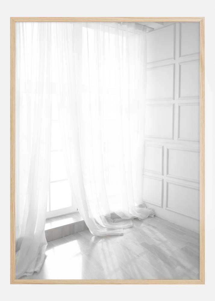 Denna lugna och renande poster föreställer ett stilla hörn av ett rum draperat med genomskinliga vita gardiner. Ljuset som silas genom tyget skapar ett spel av skuggor och nyanser på det blanka golvet, vilket ger en känsla av fridfullhet och klarhet. Detta minimalistiska print är ett uttryck för stillhet och skulle passa perfekt i en miljö som strävar efter enkelhet och lugn.