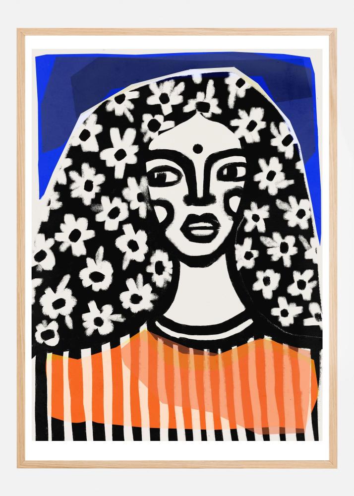 Upptäck en unik och uttrycksfull affisch som fångar din uppmärksamhet med sitt djärva och konstnärliga uttryck. I förgrunden av motivet ser vi en stiliserad kvinnlig gestalt vars ansikte och hår är dekorerade med enkla men kraftfulla mönster av blommor. Den moderna konstens influenser är uppenbara i den förenklade och nästan grafiska framställningen av denna figur.