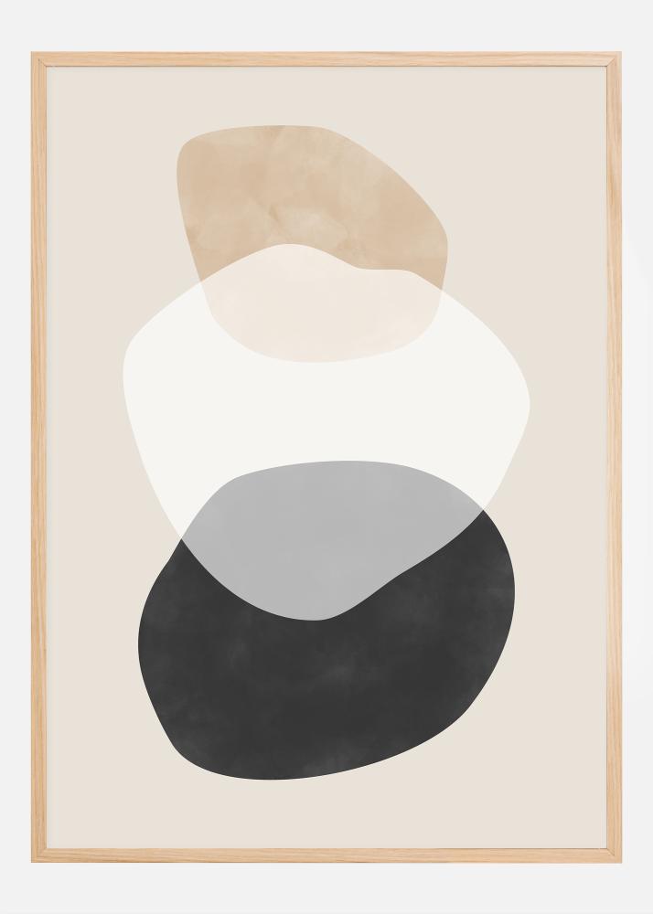 Denna konstnärliga affisch utstrålar en lugn och modern estetik som passar perfekt in i ett samtida hem eller kontor. Med en minimalistisk design som består av överlappande abstrakta former, erbjuder detta motiv en harmonisk balans mellan mjuka konturer och subtila färgkontraster. Färgpaletten innefattar toner av beige, creme, grått och djupt svart, vilket skapar ett diskret men ändå djärvt uttryck på väggen. Det enkla men effektfulla konstverket är en finstämd representation av skandinavisk design, idealisk för att skapa en avkopplande atmosfär i vilket rum som helst.