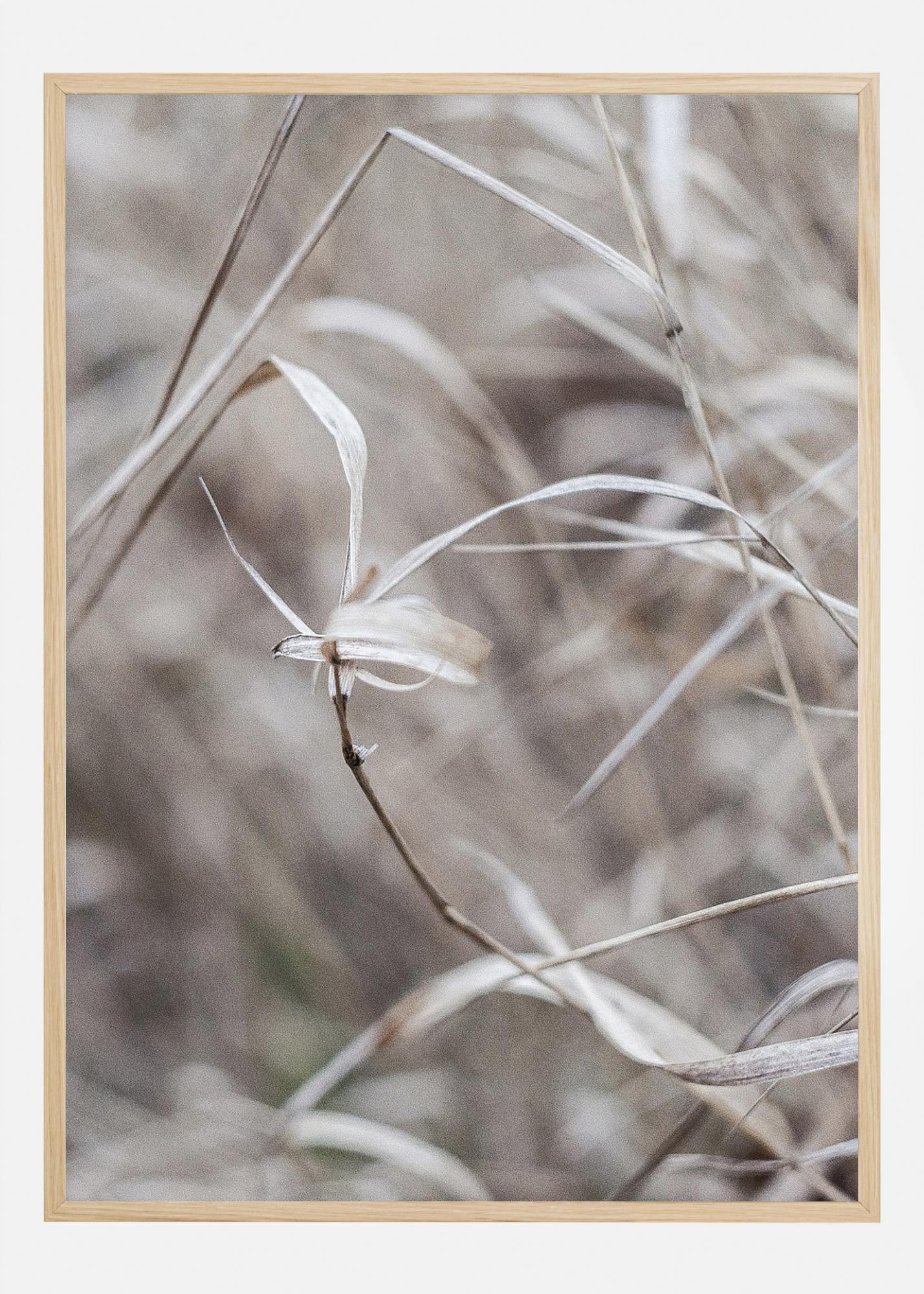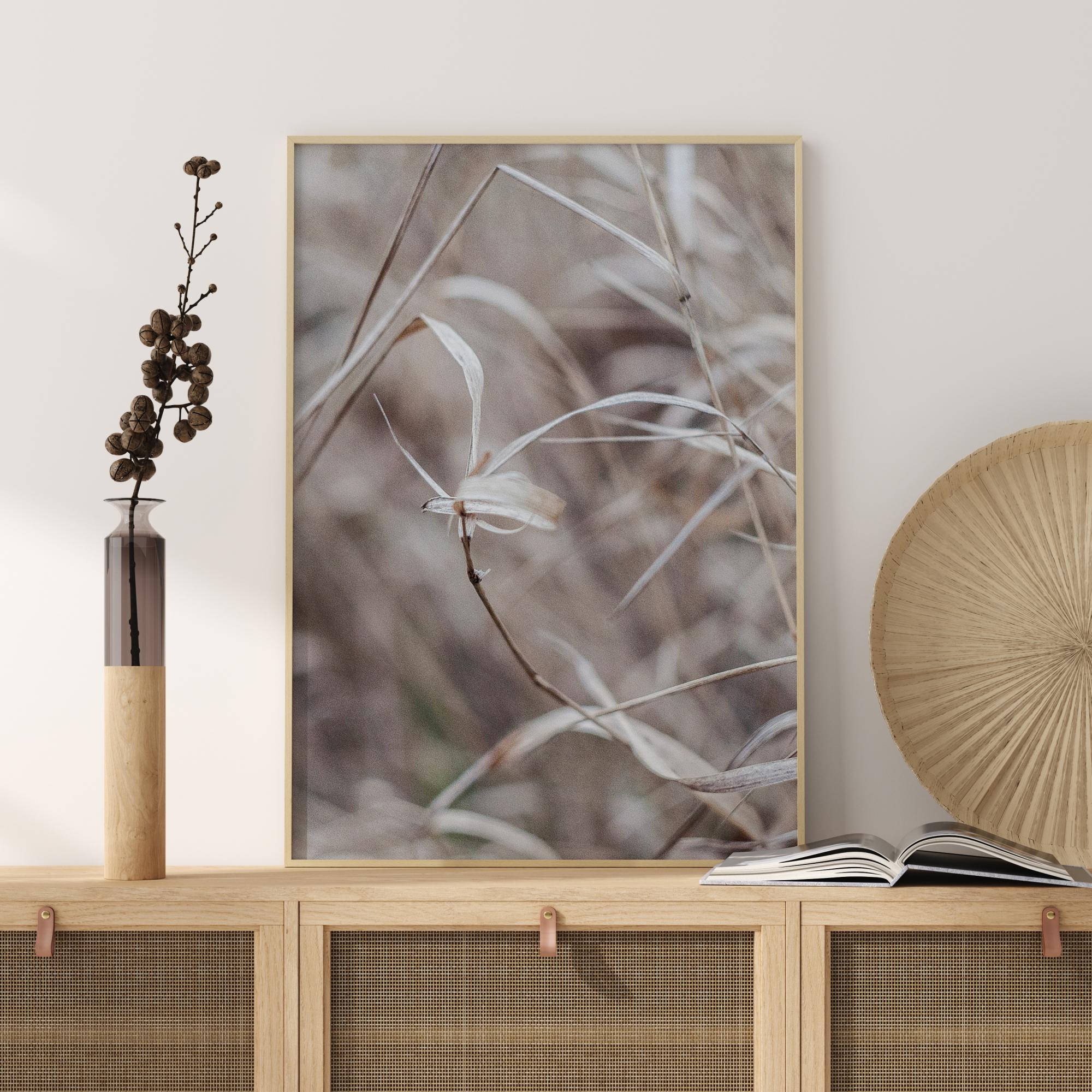 En elegant naturposter med mjuka löv i närbild. De mjuka stjälkarna och löven leder blicken runt verket. En känsla av djup uppstår tack vare att bakgrunden är ur fokus. Häng den här bilden på en ljus blockfärgsvägg för att de mjuka neutrala pastellfärgerna ska sticka ut.