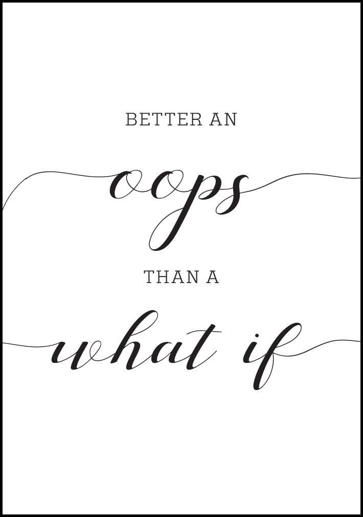 https://www.bga.se/better-an-oops-than-a-what-if51024411Better an oops than a what if Posterhttps://www.bga.se/resource/u2vG/0dl/TCgOWYTiUf2/Affischer-Posters/2018-08/med-ram/quotes_mar_2018-2-08.jpghttps://www.bga.se/resource/u4eq/4L6/H7CD8pfIZm7/Prints/Category/quotes_mar_2018-2-08.jpg49.00SEKDiscontinued/Posters/Posters/NyheterPostern trycks i vår egen printstudio på ett 230 grams premiumpapper som är FSC-cerifierat och åldersbeständigt. Vi har valt den kraftiga tjockleken och matta ytan för att det har en kvalitetskänsla och ger ett snyggt tryck utan reflektioner. Eftersom pappret kommer från ett hållbart skogsbruk och vi själva trycker upp produkten minskar vår miljöpåverkan.Ram ingår inte, men kan beställas till.Bildverkstad13x18 cm13x18 cm2018-08-14T21:22:42+02:00
