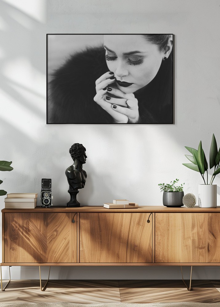 Med personens händer försiktigt vilande mot ansiktet och en dunkel bakgrund, skapar denna print en känsla av eftertänksamhet och introspektion. Den svarta färgen dominerar motivet med inslag av vit som kontrasterar och lyfter fram detaljerna, vilket ger ett dramatiskt uttryck. Perfekt för att skapa en elegant atmosfär i hemmet eller på kontoret, denna affisch är ett inspirerande komplement till vilken vägg som helst.