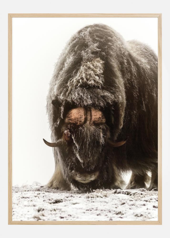 En vildmarksposter med en snötäckt jak. Jakens långa bruna päls ser mjuk och frodig när han står vänd mot kameran och letar efter mat. Den snövita bakgrunden får honom att sticka ut och skänka lite dramatik till bilden. Häng den här på din vägg för en vintrig känsla.