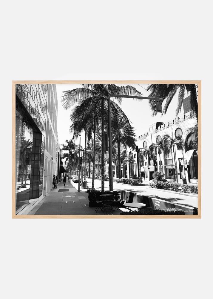 Ett fotografi i gråskala över en gata i Beverly Hills som kantas av vackra palmer, stora blomsterurnor och grönskande buskar, taget av fotograf Saphira Consilio. En lugn och stillsam poster som passar de flesta inredningsstilar.