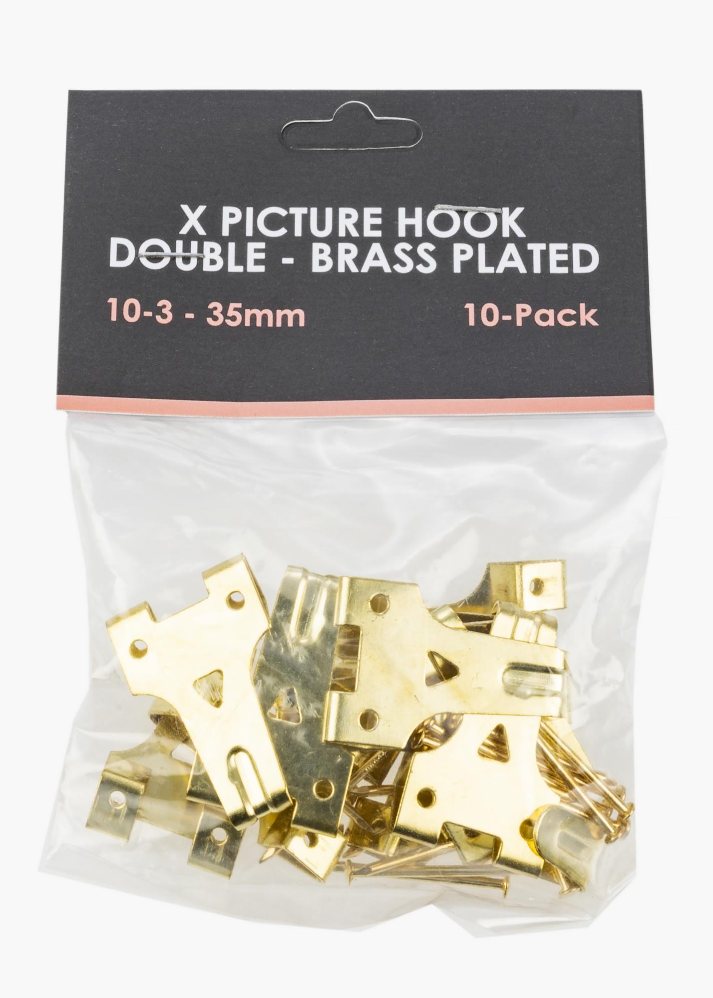 Dubbel X-krok för montering på trä- eller gipsvägg. Klarar belastning upp till 10 kg. Mässingfärgad.