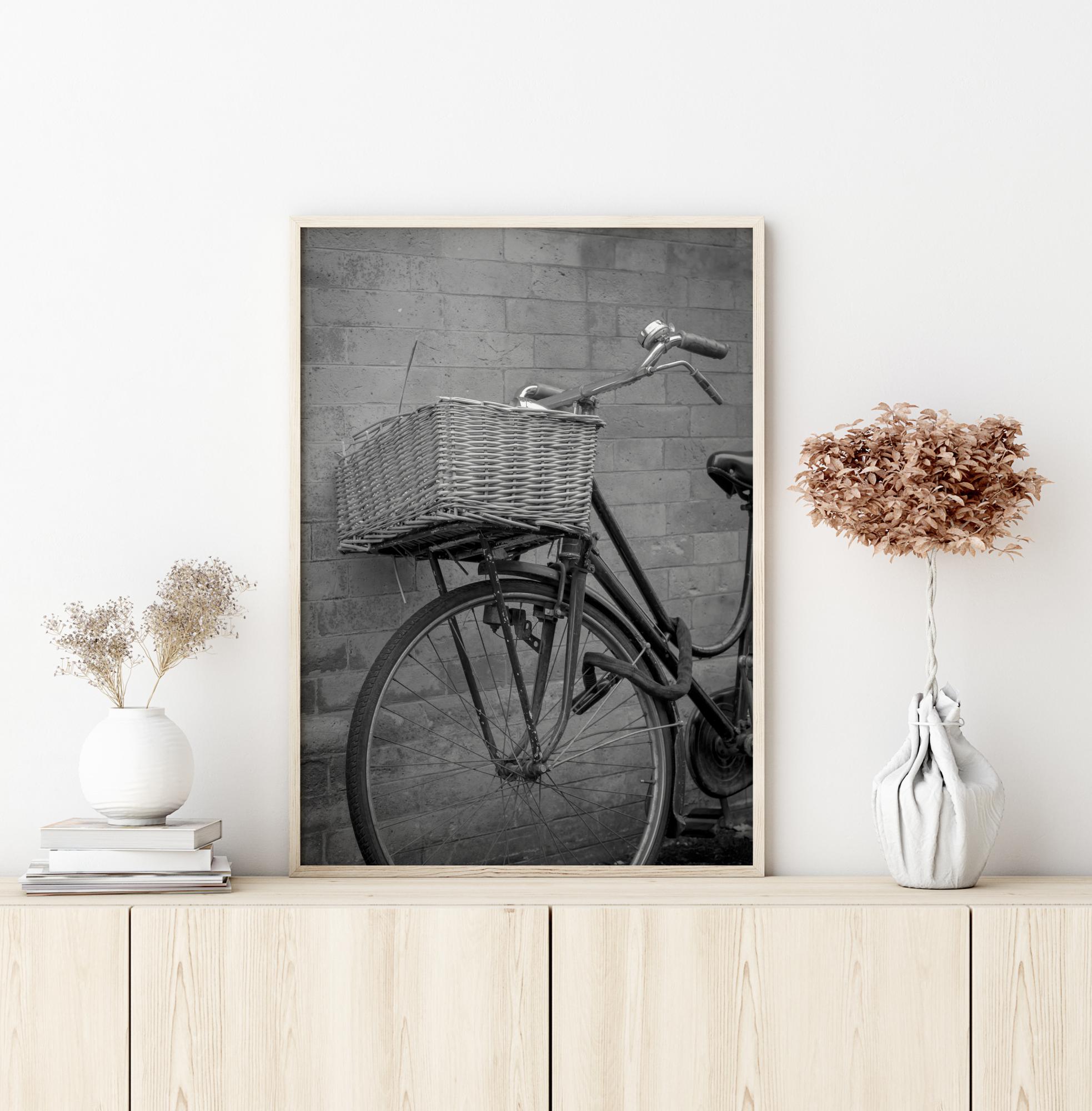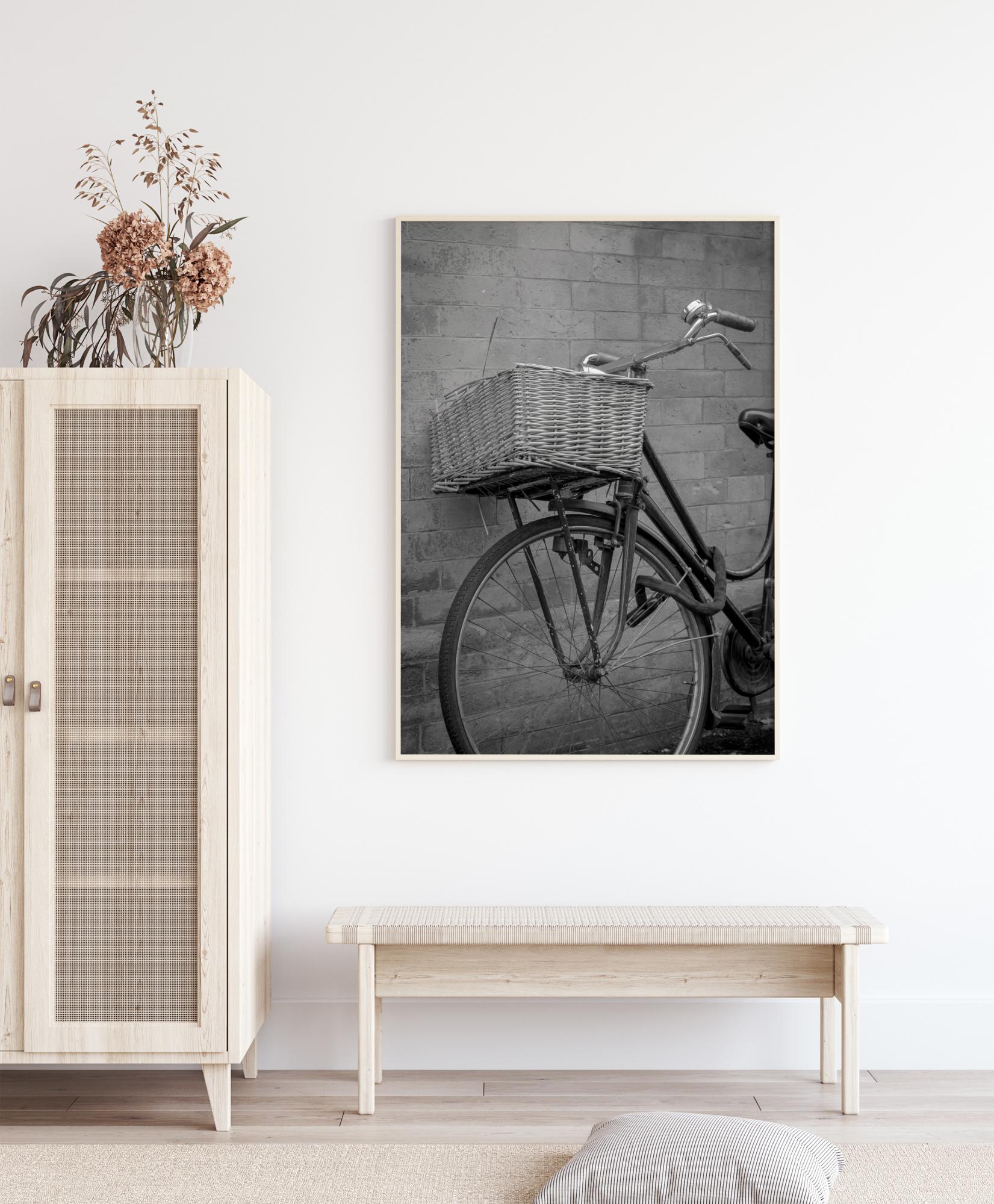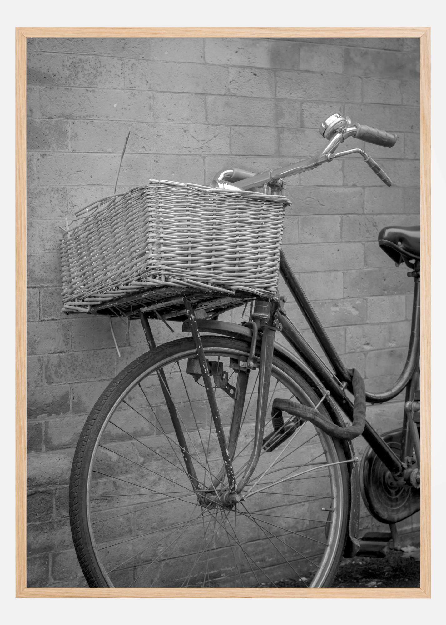 En stilleben-poster med en cykel som står lutad mot en tegelvägg. Cykelkorgen är i fokus och den kontrasterande svarta ramen och cykellåset leder blicken runt postern. Häng upp den här enkla men eleganta bilden på en ljus vägg för en smakfull effekt.
