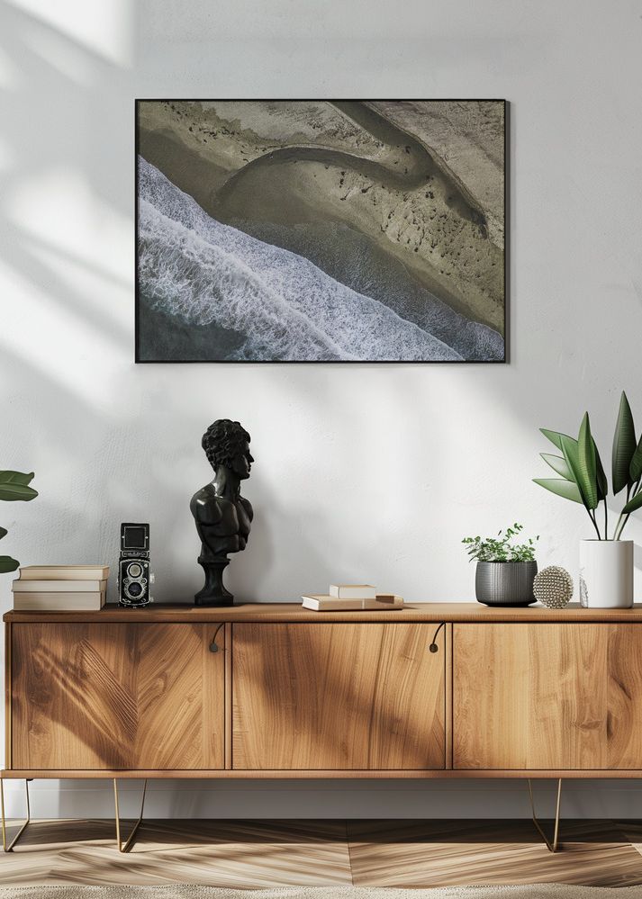 Denna poster fångar det fascinerande mötet mellan land och hav från ett fågelperspektiv. Bilden visar en dramatisk kustlinje där vågornas vita skum slår mot den mjuka sandstranden. Färgskalan inkluderar djupa blå nyanser från havet som gradvis övergår till turkost nära stranden, samt varma beige- och bruna toner från sanden, vilket ger en harmonisk kontrast.