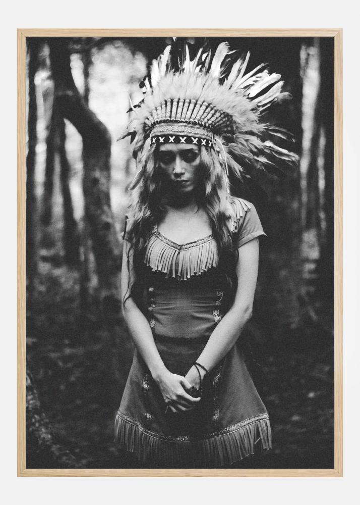 En porträttposter med en indianflicka i skogen. Den här starka svartvita bilden låter de vita fjädrarna på huvudbonaden sticka ut mot den mörka trädstammen. Låt dig uppleva ett eftertänksamt ögonblick när hon sänker blicken mot sina knäppta händer.