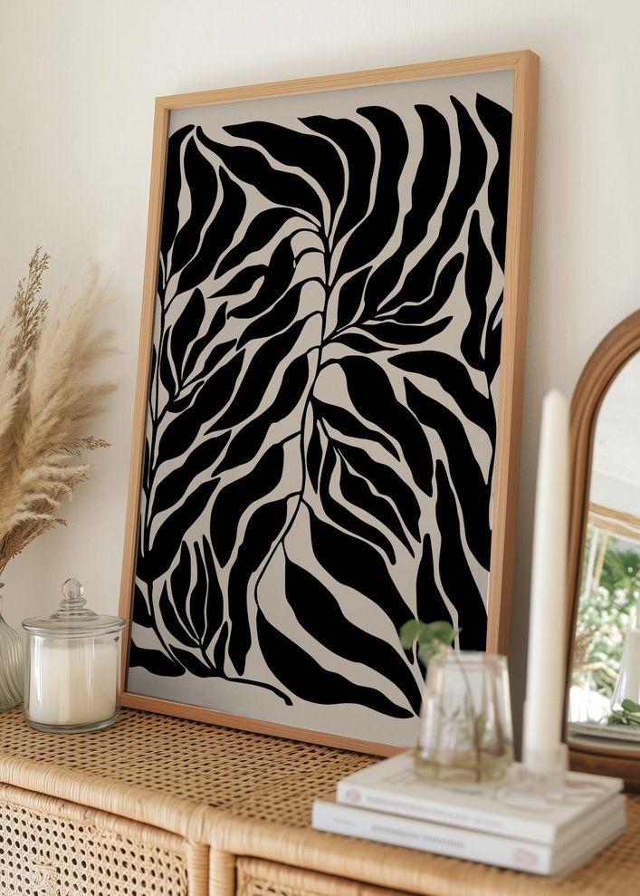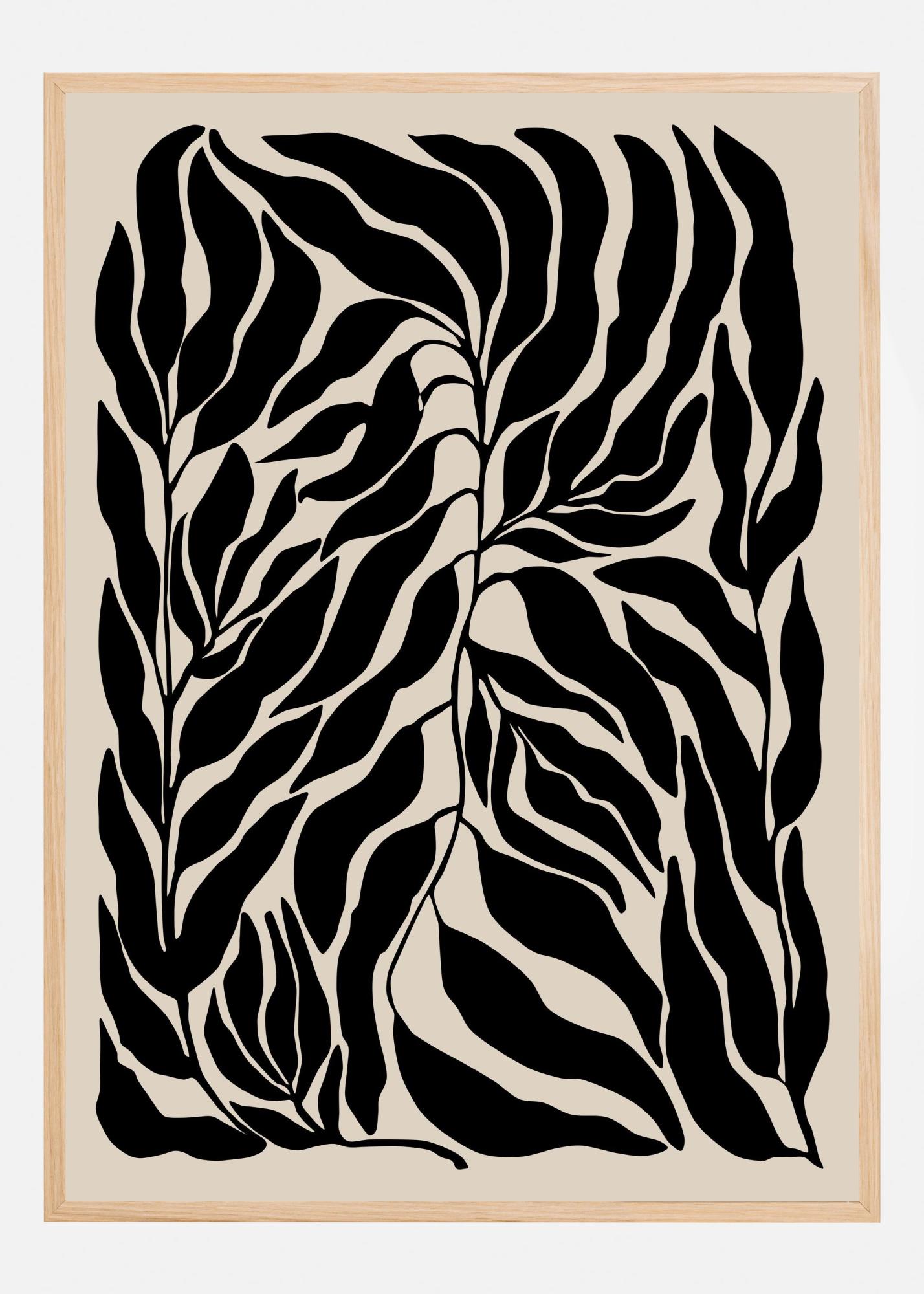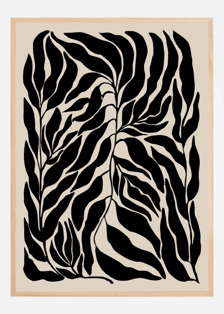 Denna stilrena affisch kännetecknas av sina abstrakta bladmotiv i en djärv svart färg mot en kontrasterande beige bakgrund. Den minimalistiska designen gör att postern lätt passar in i olika typer av inredningar, från det moderna till det traditionella. Motivet, med sina svepande linjer och lekfulla former, skapar en intressant dynamik som fångar ögat och blir en självklar samtalspunkt i rummet.