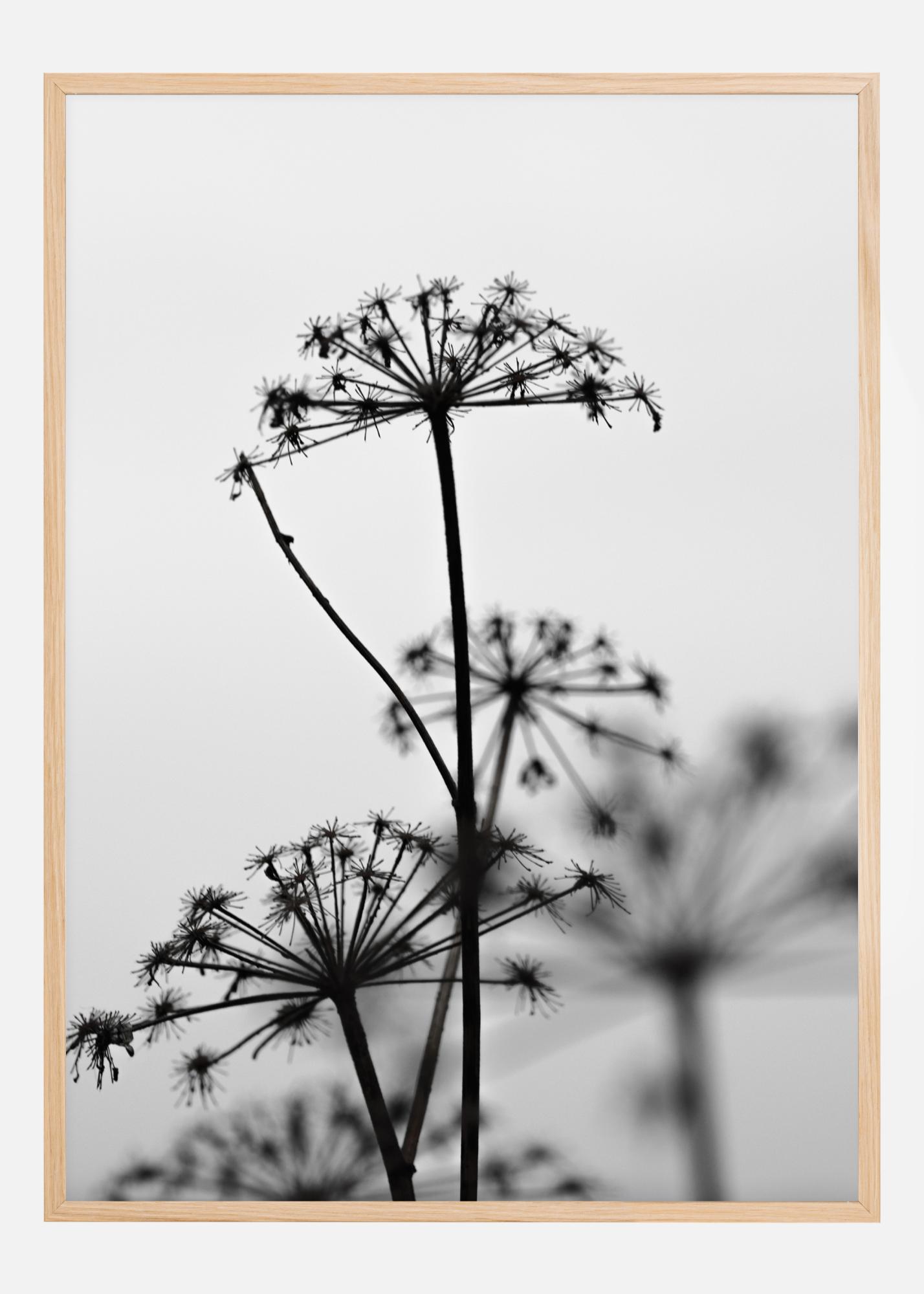 En enkel poster med flockblommiga växter mot en vit bakgrund. De svarta silhuetterna av dessa flockblommors stjälkar och fröhuvuden står i kontrast med den enkla vita bakgrunden. Häng upp den här fascinerande bilden på en färgad vägg för att få blommornas detaljer att sticka ut.