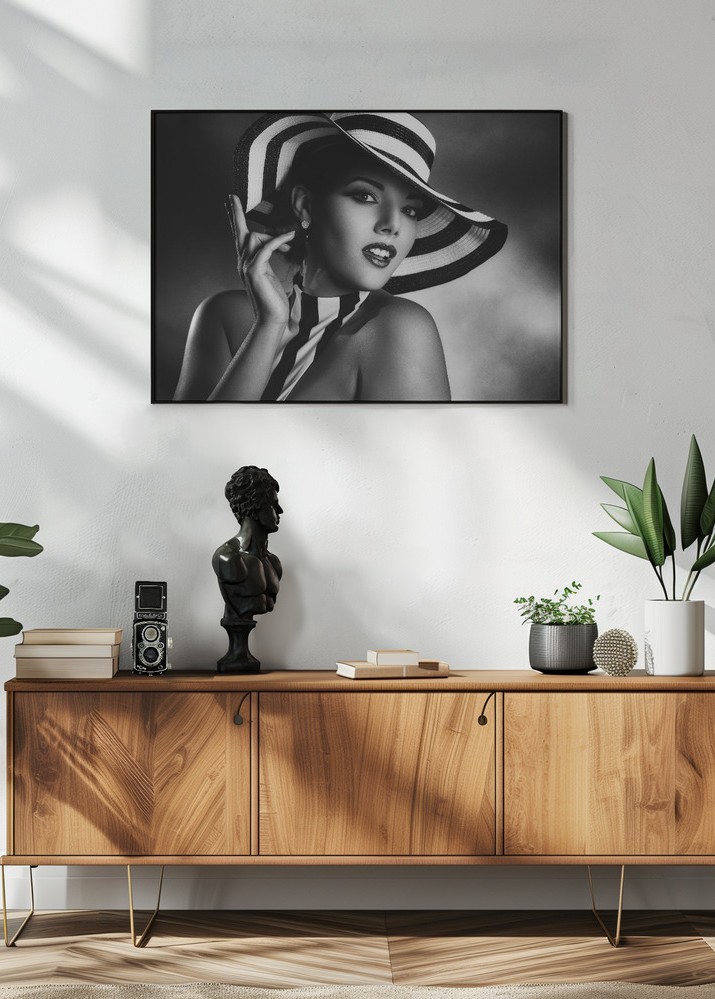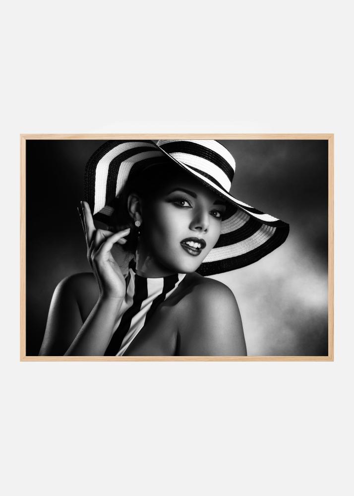 Denna eleganta poster fångar ett klassiskt svartvitt motiv med en tidlös känsla. Kvinnan i bilden bär en stilfull hatt med bred brätte, vilket adderar en sofistikerad touch till affischen. Kontrasterna mellan de djupa svarta tonerna och de ljusa vita områdena skapar en dramatisk effekt som drar ögat till sig och passar perfekt i moderna heminredningar.