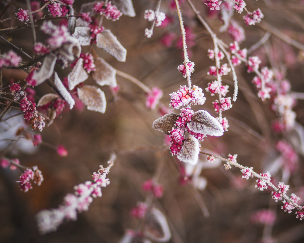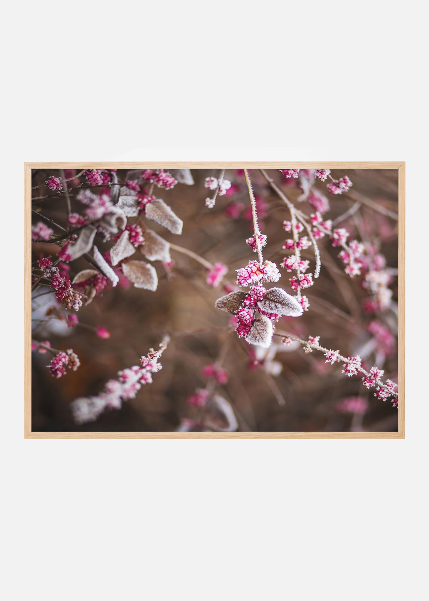 Fotokonst med närbild på frostnupna rosiga bär med ett kort skärpedjup. Printet ger med bären i rosa och bakgrunden i chokladtoner en varm och ombonad känsla. I en större storlek med en snygg ram blir tavlan ett blickfång i vardagsrummet eller sätt en mindre variant i tavelcollaget tillsammans med andra posters i samma färgnyanser.