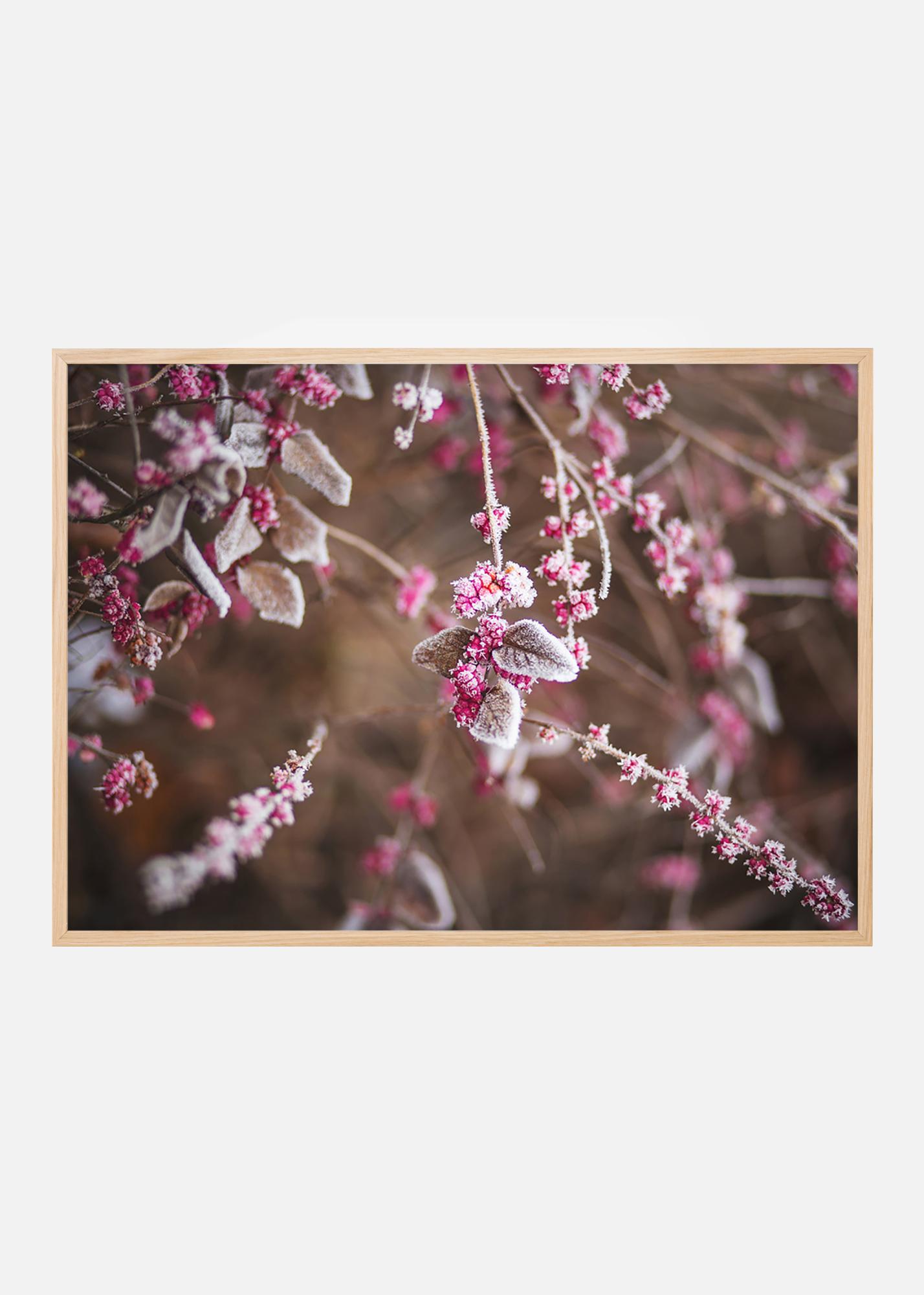 Fotokonst med närbild på frostnupna rosiga bär med ett kort skärpedjup. Printet ger med bären i rosa och bakgrunden i chokladtoner en varm och ombonad känsla. I en större storlek med en snygg ram blir tavlan ett blickfång i vardagsrummet eller sätt en mindre variant i tavelcollaget tillsammans med andra posters i samma färgnyanser.