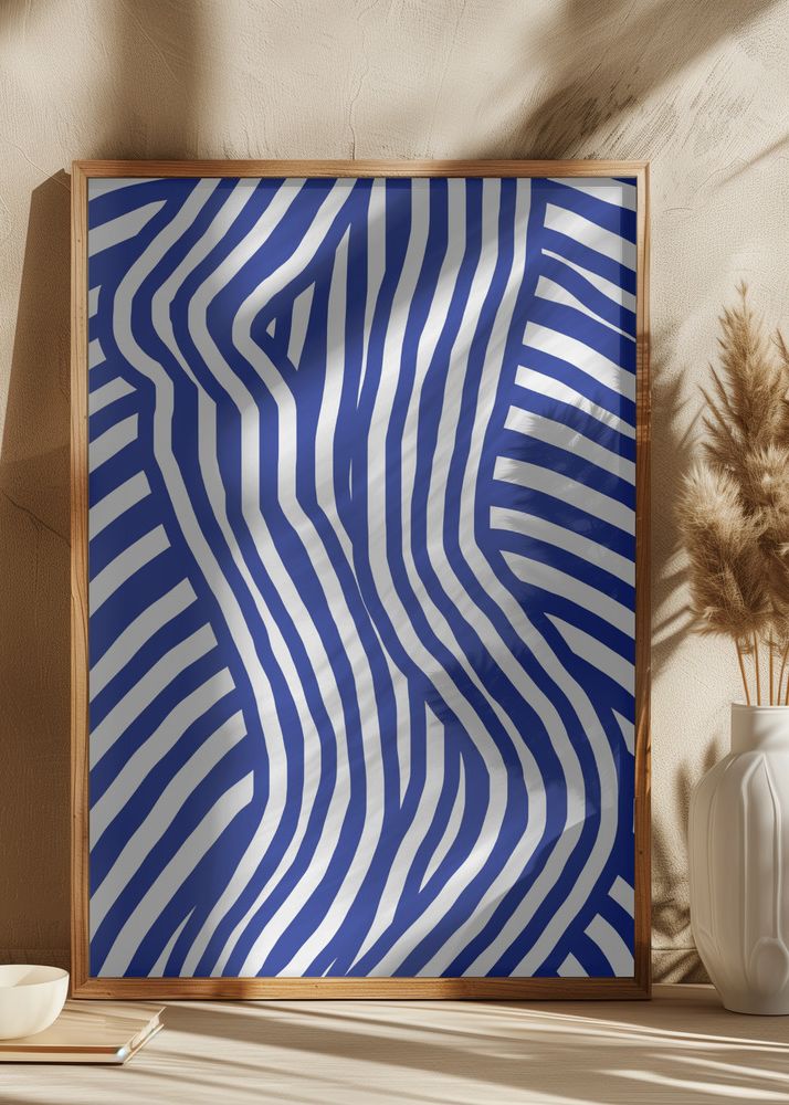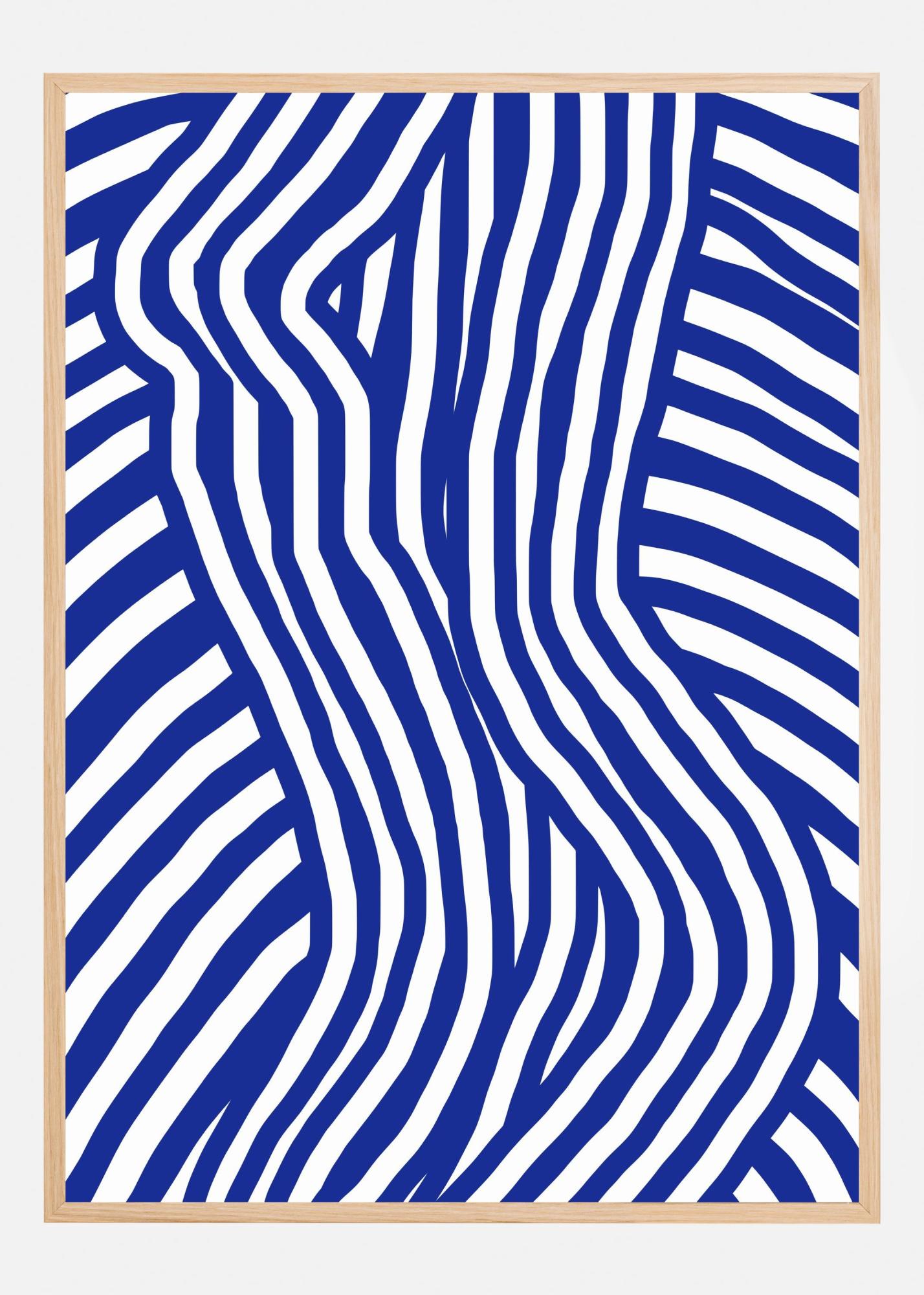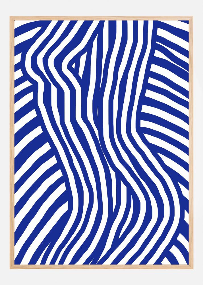 Färgerna i denna affisch är inte bara distinkta och uppfriskande men de är också enkla att matcha med olika inredningsstilar. Den klarblå färgen kan bringa ett lugn till rummet samtidigt som den vita bakgrunden tillåter mönstret att stå ut och fånga blickar. Det grafiska designmotivet är perfekt för den som söker en modern och stilren dekoration som fortfarande bär på en stark visuell dynamik.