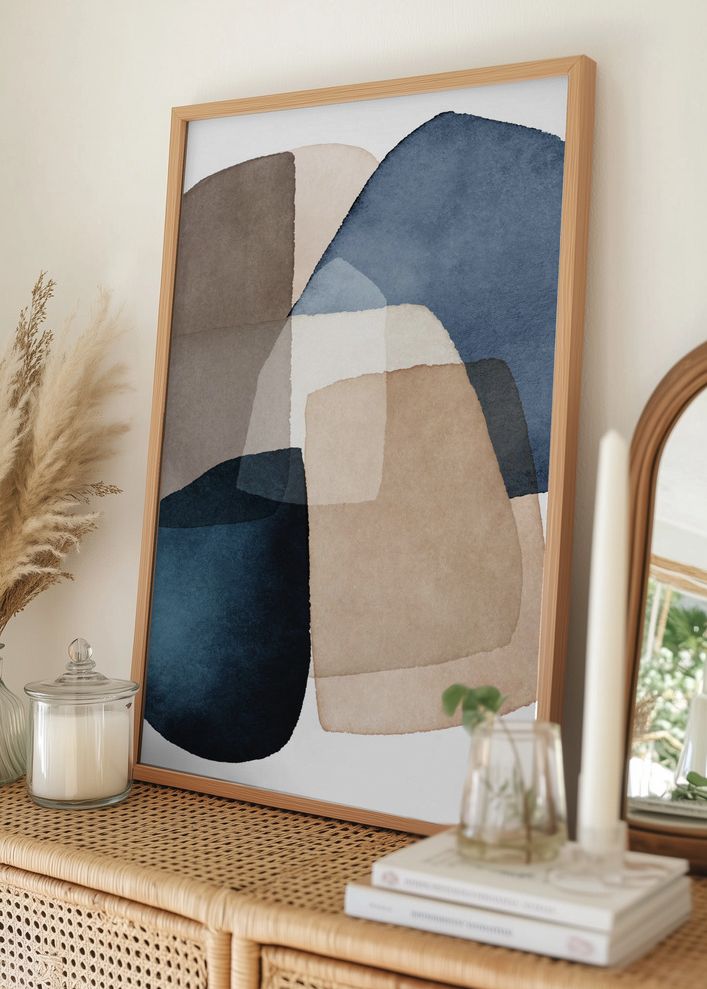 Denna moderna poster förenar mjuka, abstrakta former med en harmonisk färgpalett. Motivet består av överlappande former i olika nyanser av blått, beige och brunt, vilket ger en lugn och inbjudande känsla till vilket rum som helst. Med sin stilrena design är denna affisch perfekt för att skapa en elegant och modern atmosfär.