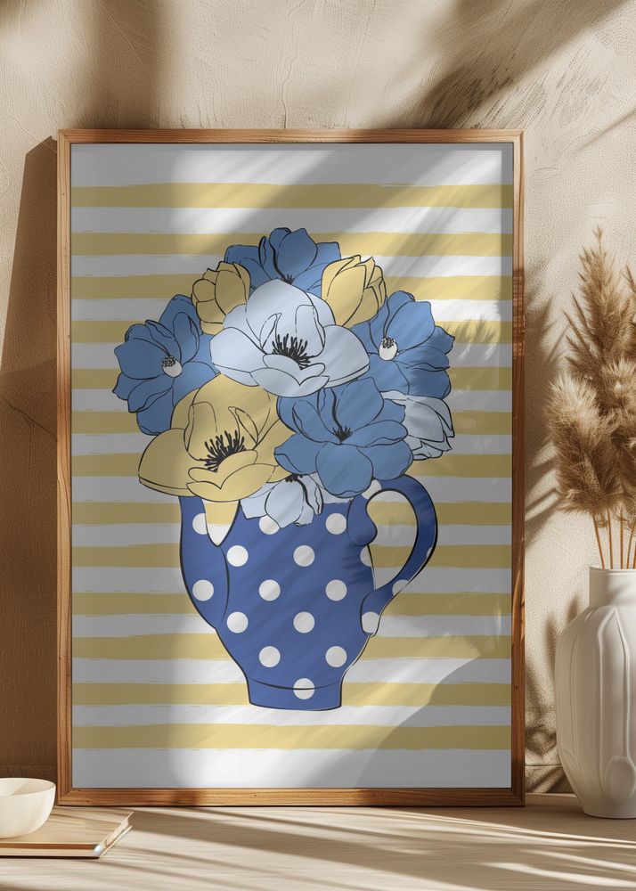 Denna charmiga och samtida poster framhäver en lekfull och estetisk design som skulle lysa upp vilket rum som helst. Motivet visar en iögonfallande och stilfull blomarrangemang i en vas med polka-prickar, vilket ger en kombination av klassiskt mönster och moderna tendenser. Detta konsttryck utstrålar en fräsch och somrig känsla och passar perfekt för att ge ditt hem en visuell höjdpunkt.