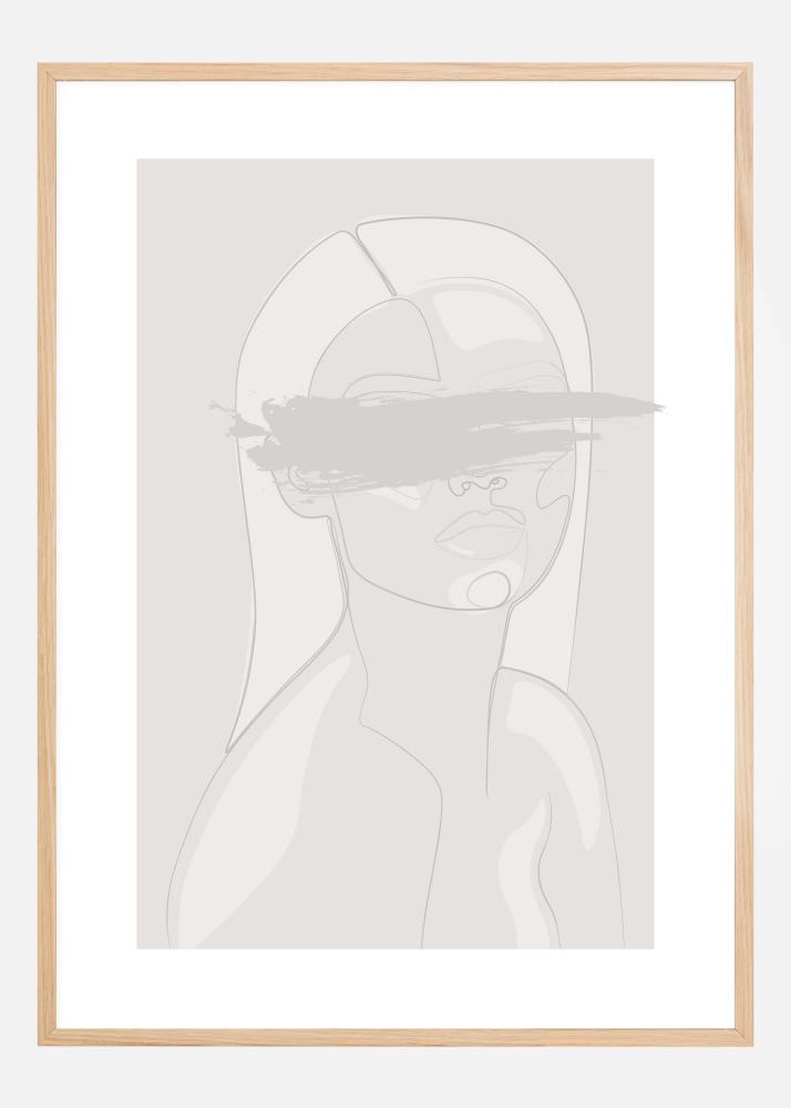 En abstrakt poster med en kvinna med täckta ögon. Den här bleka vita och gråa bilden visar en kvinnas huvud och axlar i blockformer och linjer. Ett stänk av färg täcker ögonen, vilket skapar mysterium runt kvinnan. En stark vit gräns ramar in henne, perfekt för att hänga på en djärvt färgad vägg i hemmet.