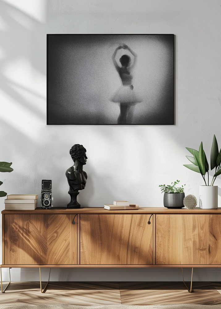 Denna eleganta poster fångar essensen av grace och rörelse med sin föreställning av en silhuett av en dansare. Med en diskret suddighet och skuggning framträder figuren i mitten, vilket ger en känsla av rörelse och mystik. Den minimalistiska stilen gör denna print till ett stilrent tillskott i hemmet, perfekt för de som uppskattar konstnärlig enkelhet och skönhet.