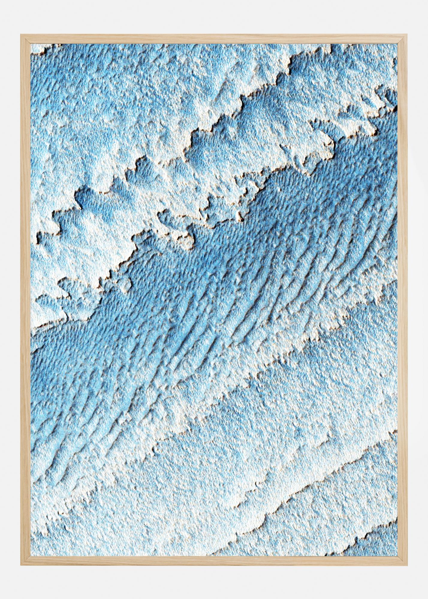 En flygbildsposter med vågor som slår mot stranden. Vita skummande linjer i varje våg medan vattnet krusar och närmar sig land. Ljusa blå och azurfärgade områden gör det här till en djärv bild. Matcha gärna med en orange vägg för att få till den fulla effekten genom dessa kompletterande färger.