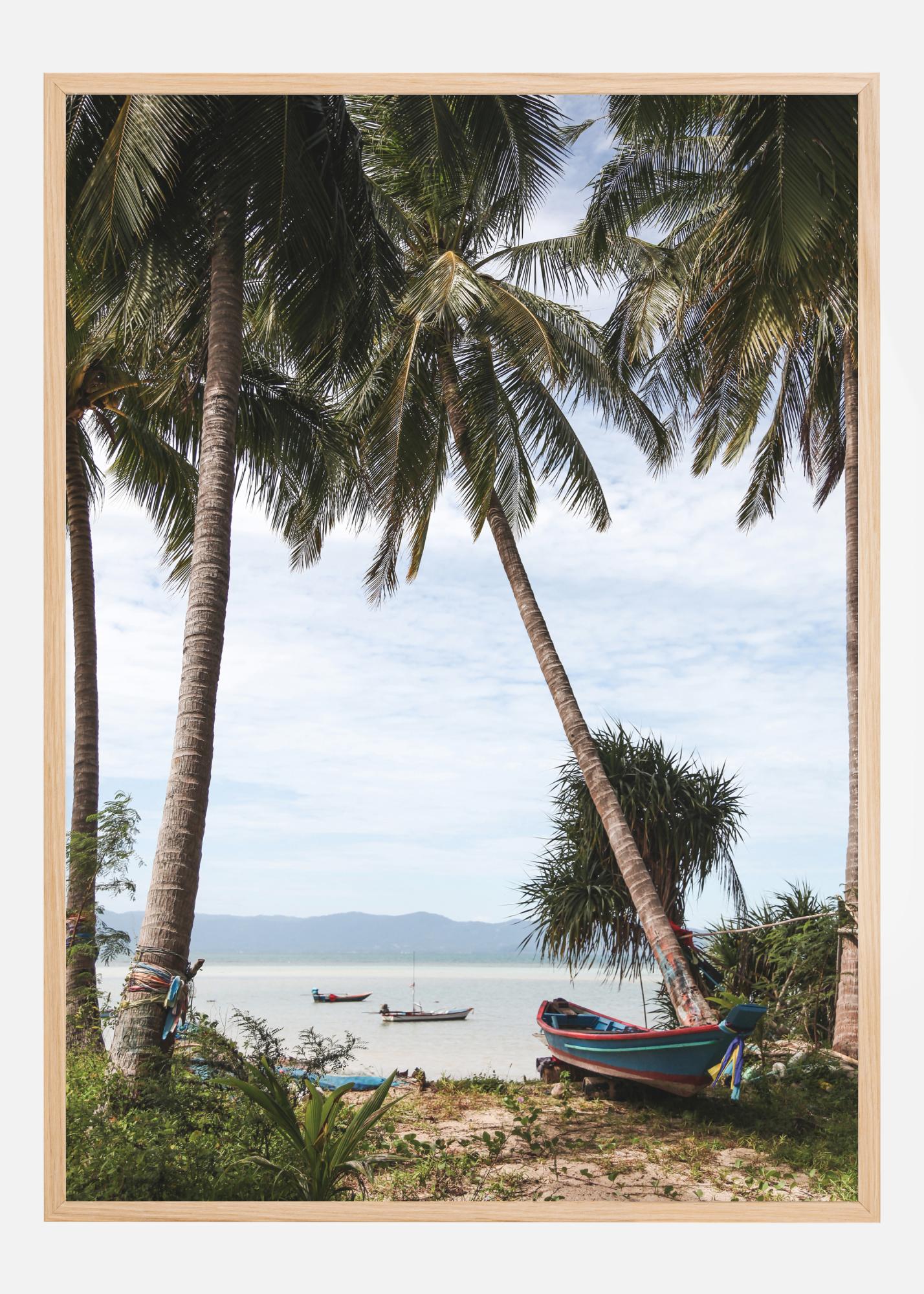 En semesterposter med palmer och båtar i Thailand. Två palmer lutar sig mot varandra vilket ramar in havet bakom där två båtar ligger. En tredje röd och blå båt ligger på land som drar blicken till sig. Tänk dig att du står på stranden medan du tittar på den här lugna bilden.