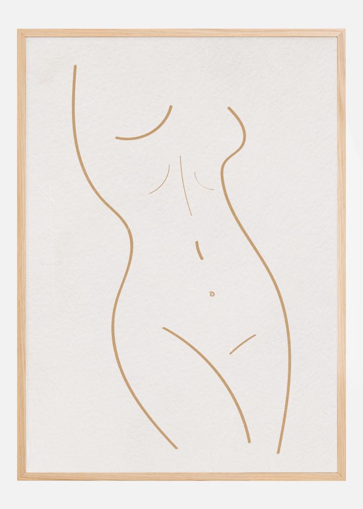 En poster med en kvinna i bruna linjer. Starka, djärva bruna linjer skisserar kvinnans ben, mage och bröst. Linjerna är jämna och uppåtgående i denna eleganta teckning. Häng det här verket på en enkel vit vägg för en gallerikänsla.