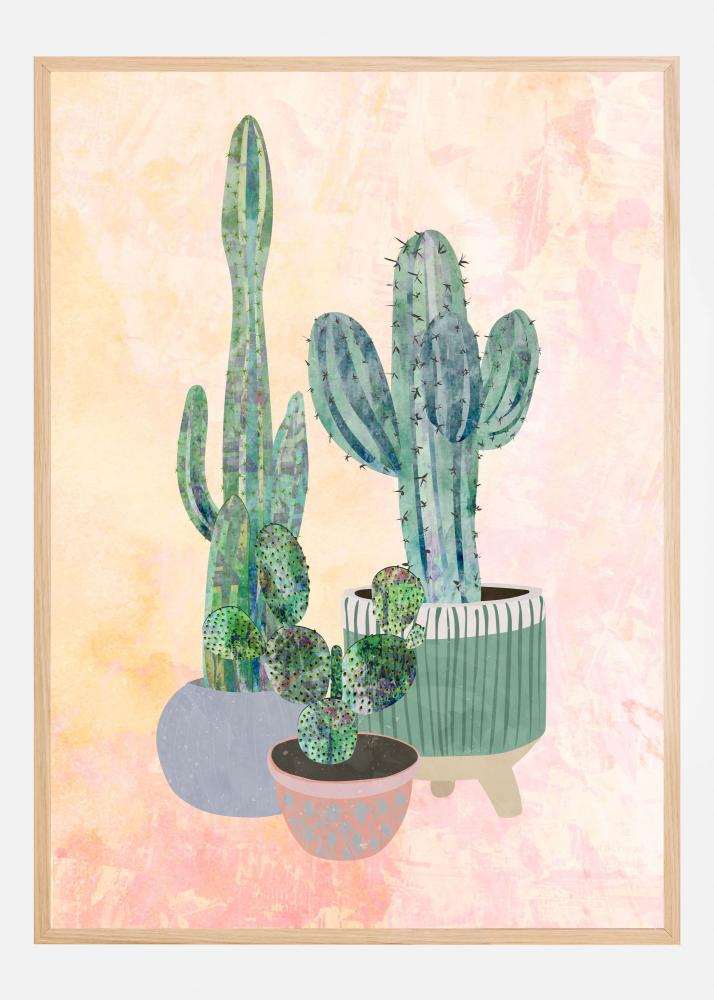 Denna charmiga poster framställer en samling kaktusar i olika former och storlekar, perfekt för att tillföra en touch av natur och fridfullhet i ditt hem eller kontor. Motivet innehåller mjuka toner av grönt som harmonierar med de subtla rosa och gula nyanserna i bakgrunden, vilket ger en behaglig och avslappnad atmosfär till bilden. Kaktusprinten är detaljerad med varierande mönster på krukorna - från enkel randighet till mer komplexa, geometriska mönster - vilket tillför ett modernt och lekfullt uttryck till designen.