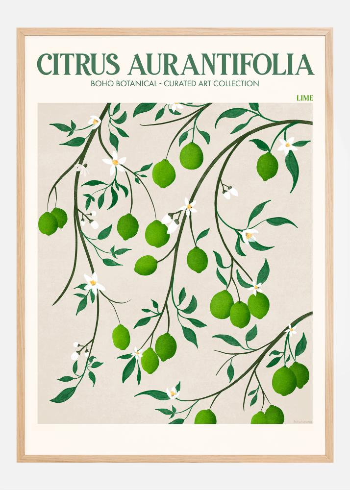 Denna eleganta och sofistikerade poster presenterar Citrus aurantifolia, känd som lime, ur vår BOHO Botanical - Curated Art Collection. Konstverket skildrar ljuvligt gröna limefrukter som dinglar från förgrenade kvistar, omgivna av mjukt vita blommor mot en neutral bakgrund. Varje element i denna affisch är noggrant framställt för att återspegla limes friskhet och vitalitet, vilket gör den till ett underbart tillägg i kök eller vardagsrum, och även i kommersiella utrymmen som kaféer eller restauranger som värdesätter en naturlig och organisk atmosfär.